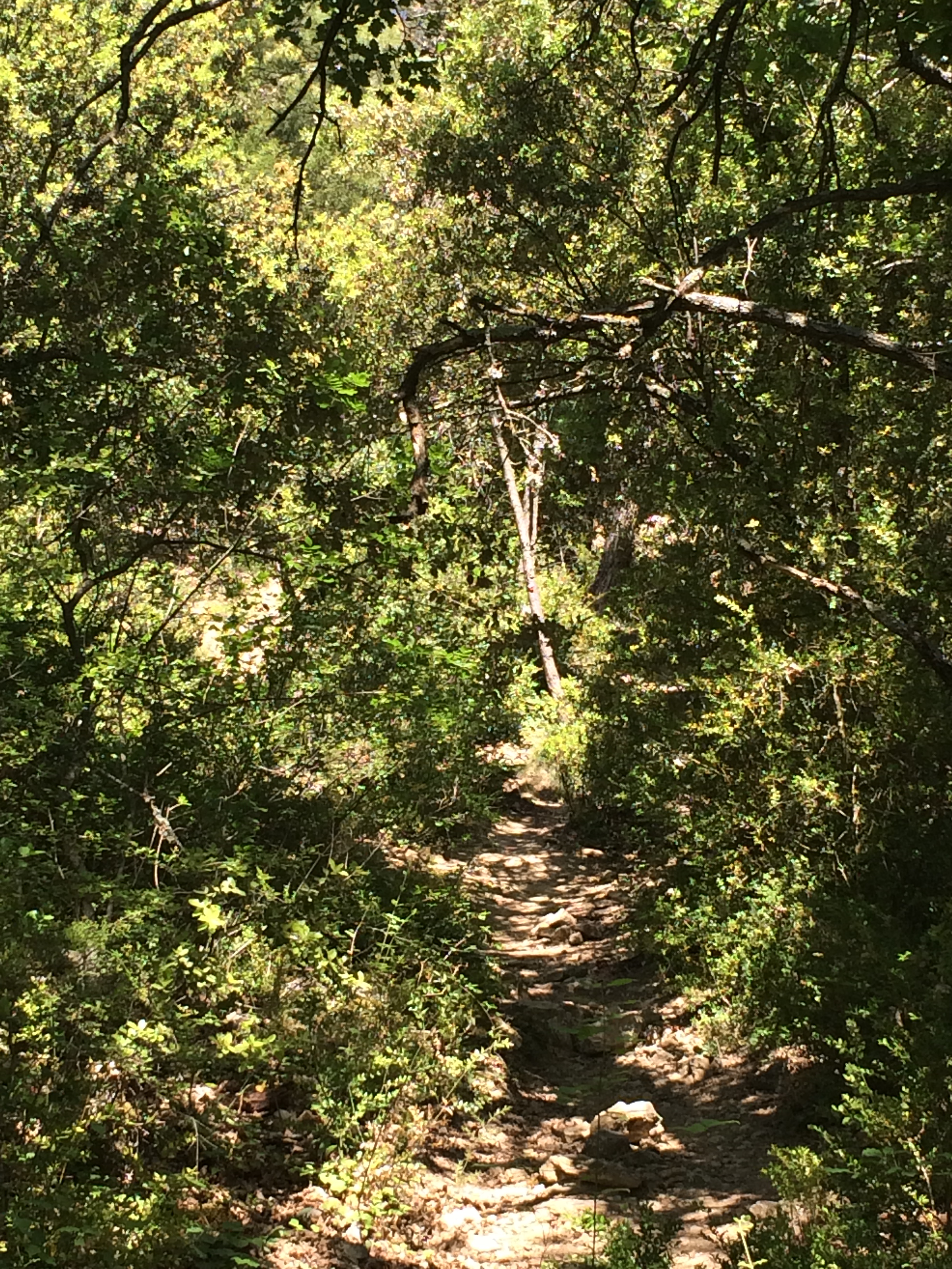 We stuck with it though and the narrow track led us on through the woodland, up steeper and more treacherous paths, before dropping down again, where we found ourselves slipping on the pebbles that slid like marbles as we walked. It was though lovely to be in the woodland, no sound of anything other than birdsong and the occasional scuttle of a lizard from the track, although we did jump a little when a small snake slithered across in front of us as we interrupted its rest in a sunny spot.