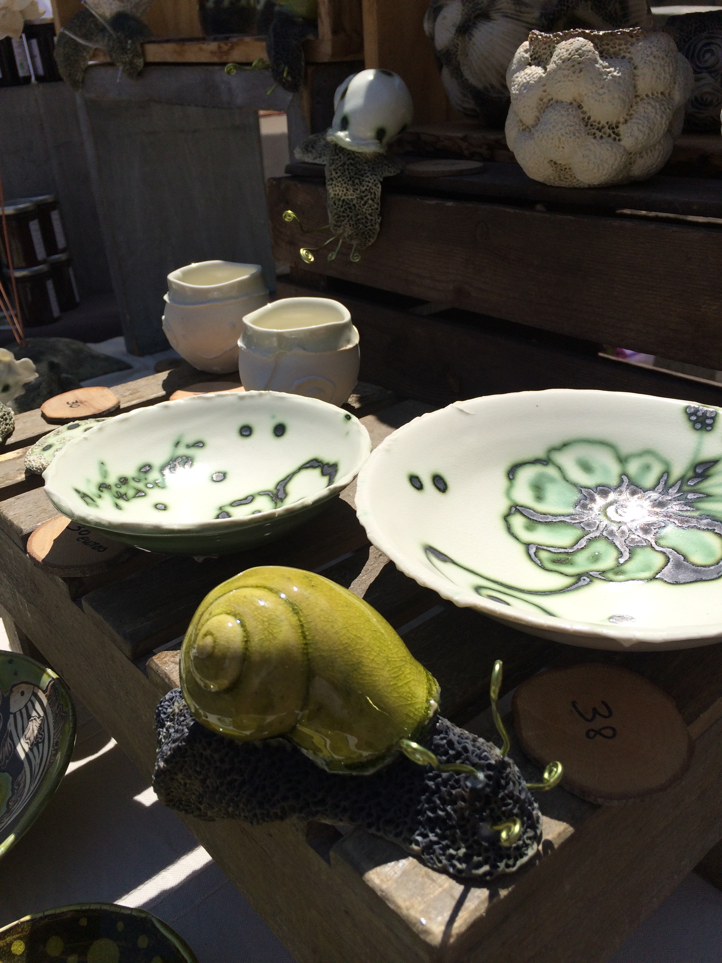 Of course, as with the other local festivals we have visited over the years, there were many other stalls selling local handicrafts, which are always lovely and Caromb was no exception. I was particularly taken by the pottery on this stall, particularly the large and rather lurid snails, which seemed ready to crawl down onto the next shelf…..