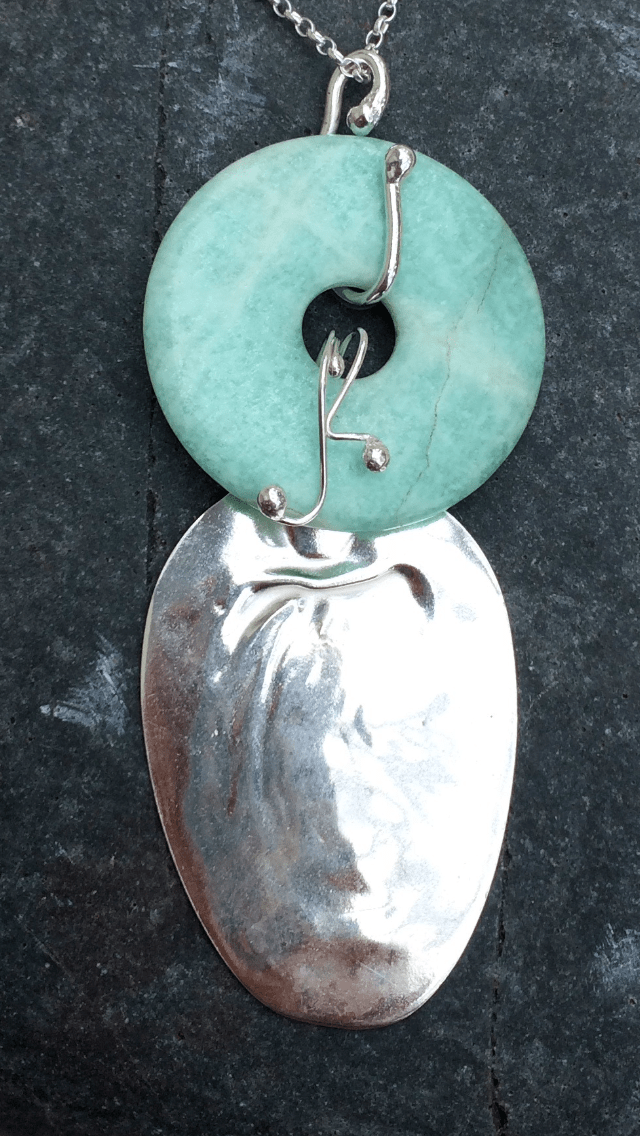 The second is made from the bowl of an antique silver spoon that has been attached using silver to an Amazonite ring & fitted to an 18 inch silver chain.