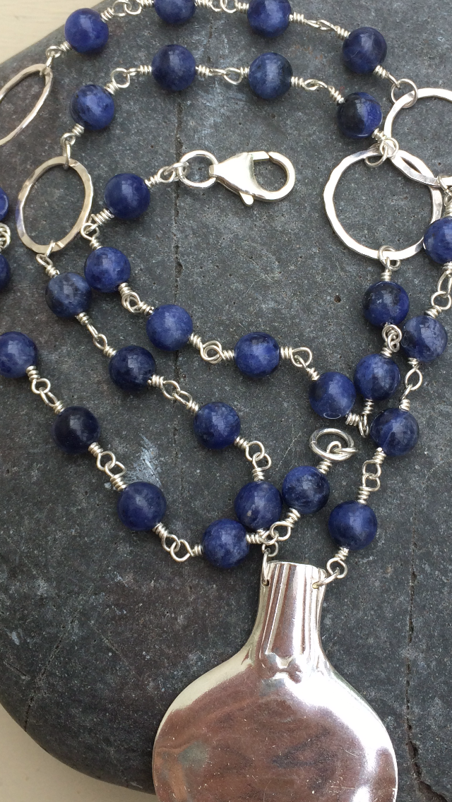 The first is made from an antique silver mustard spoon, which has been added to a 20 inch hand-wired sodalite & silver necklace.