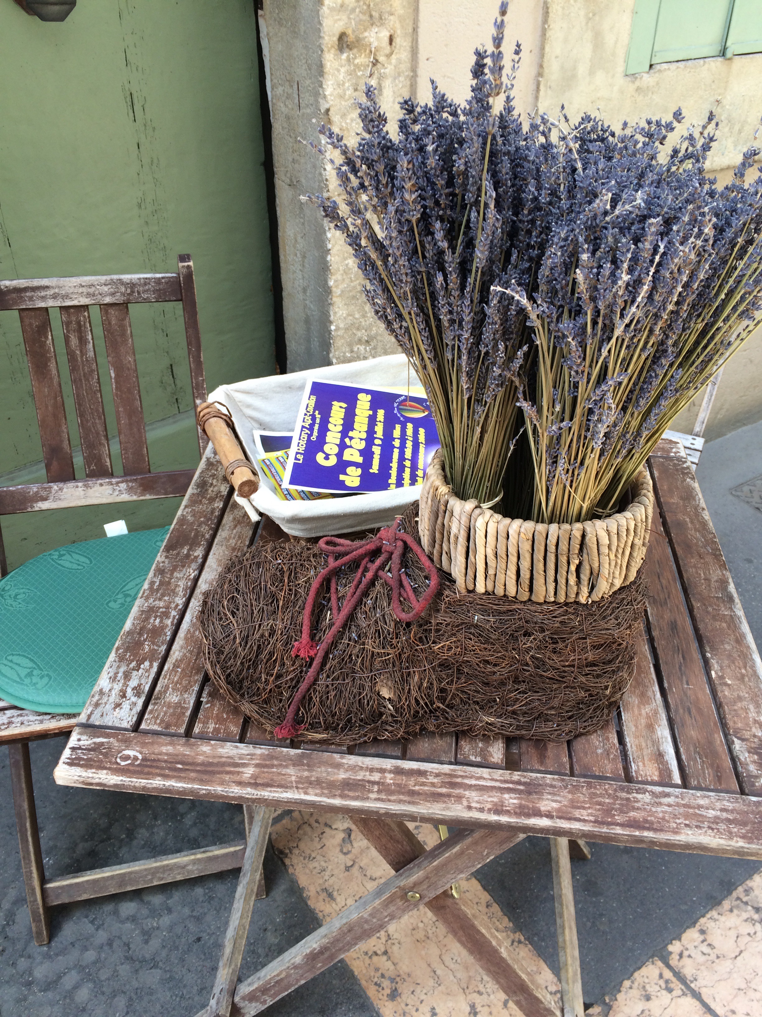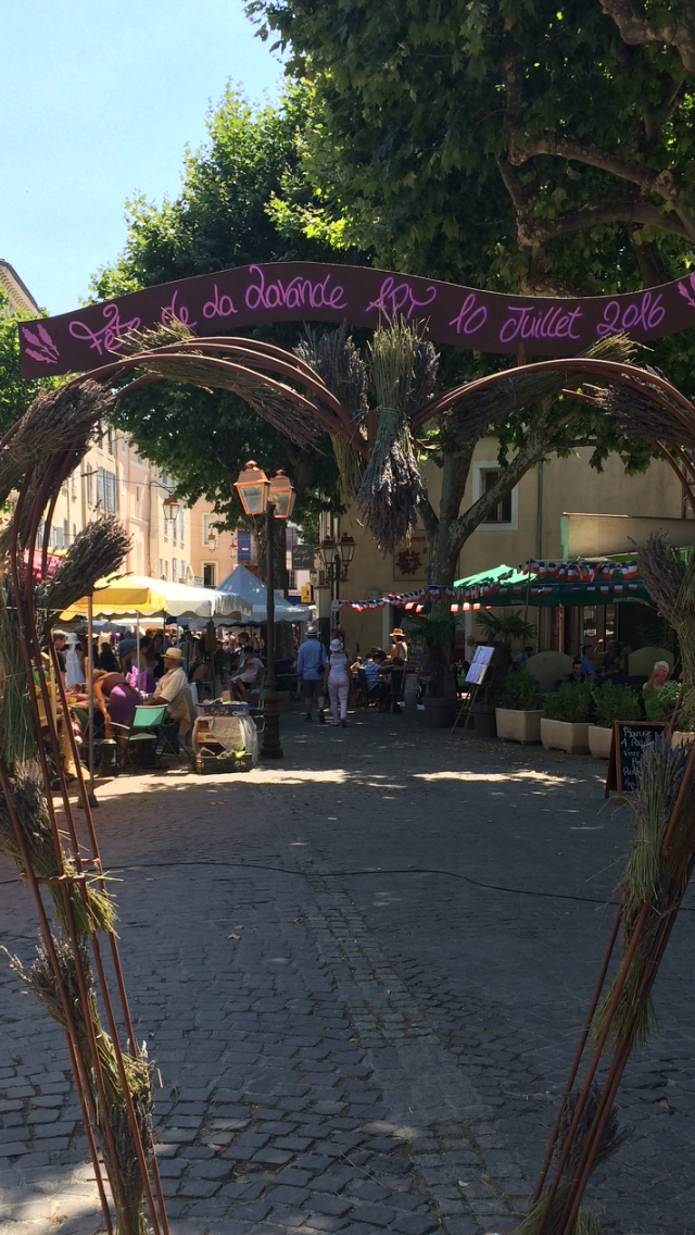 Not only have the fields around the town been scenting the air with Lavender, but purple bunting has appeared, shops have had tables outside with displays of lavender flowers & plants have been appearing in the street. All a pre-cursor today’s ‘Fete de la Lavande’.