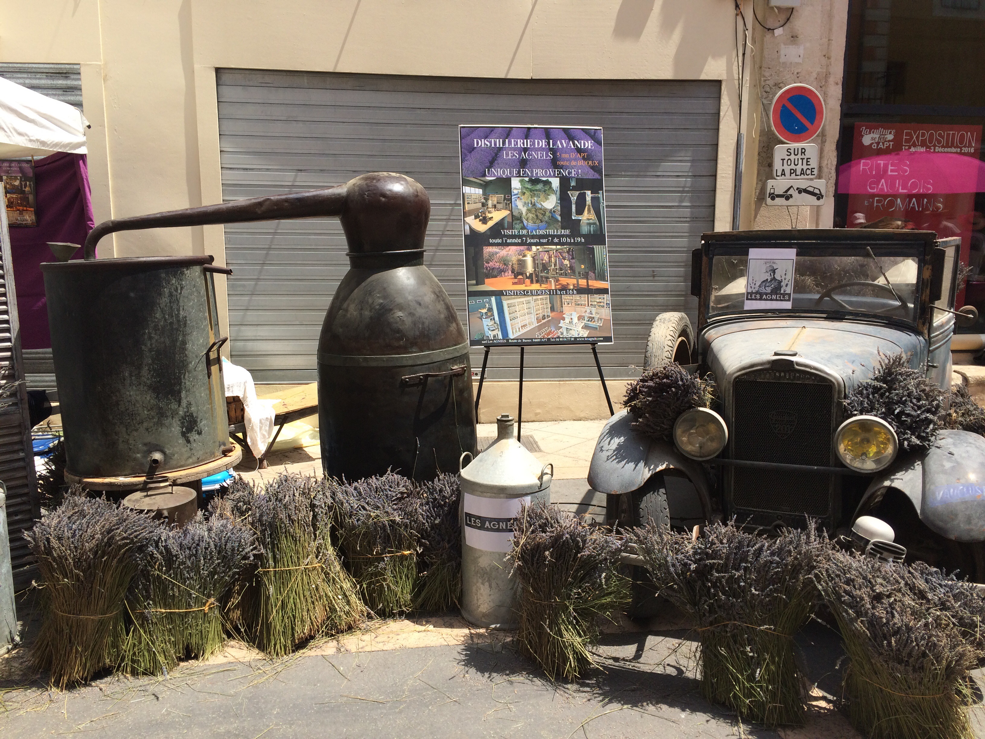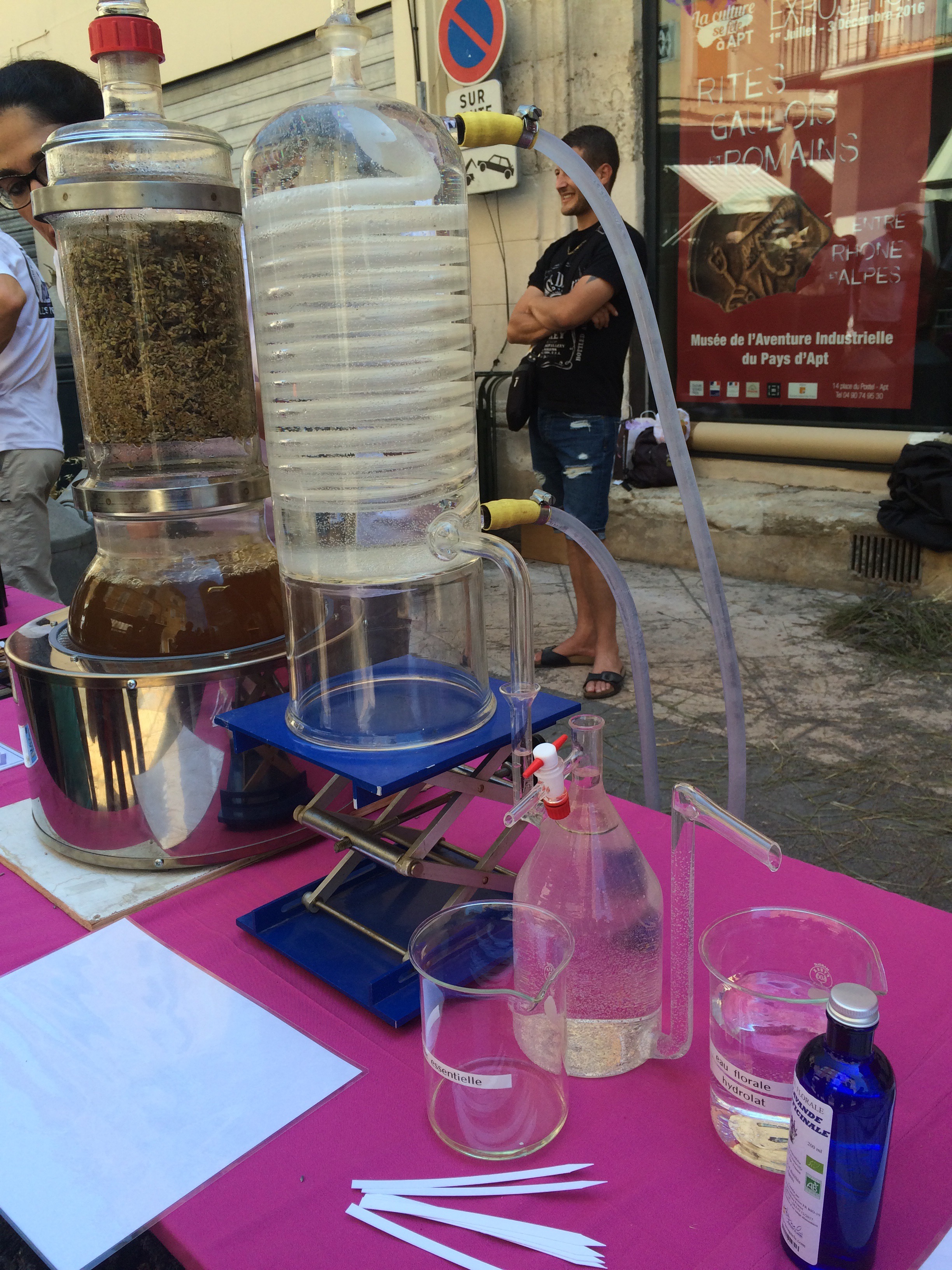 Arriving in the town the first thing that struck me was the scent of lavender that filled the air. I’ve enjoyed the scent whilst cycling through the lavender fields, but this was in a totally different level, mainly (I soon realised) from the various distilling machines that had been set up across the town. From large, mobile machines…..