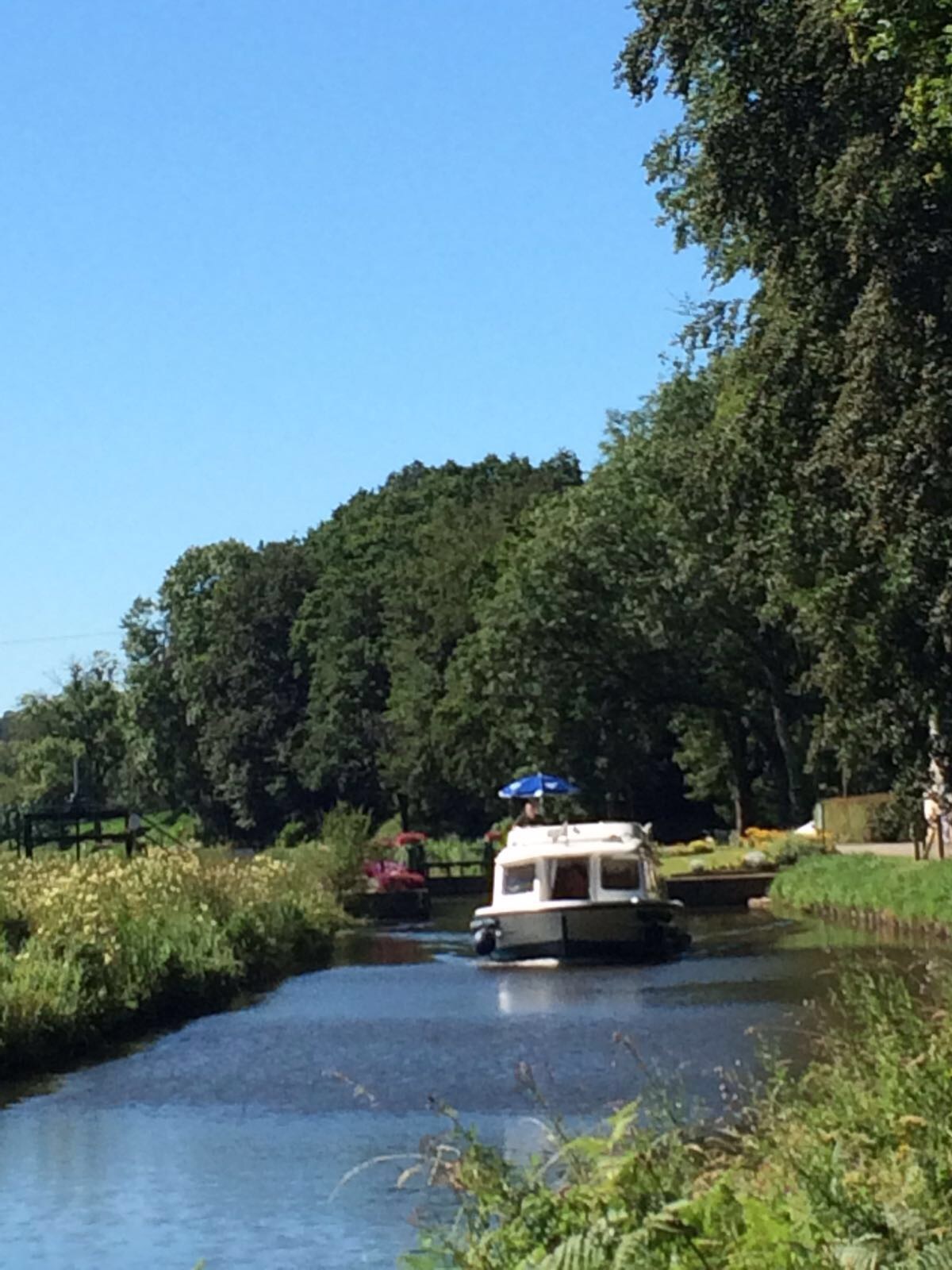 Whereas for a good part of yesterday’s ride the Canal was overgrown, today saw them cycling along open stretches of water, with passing boats to keep them entertained.