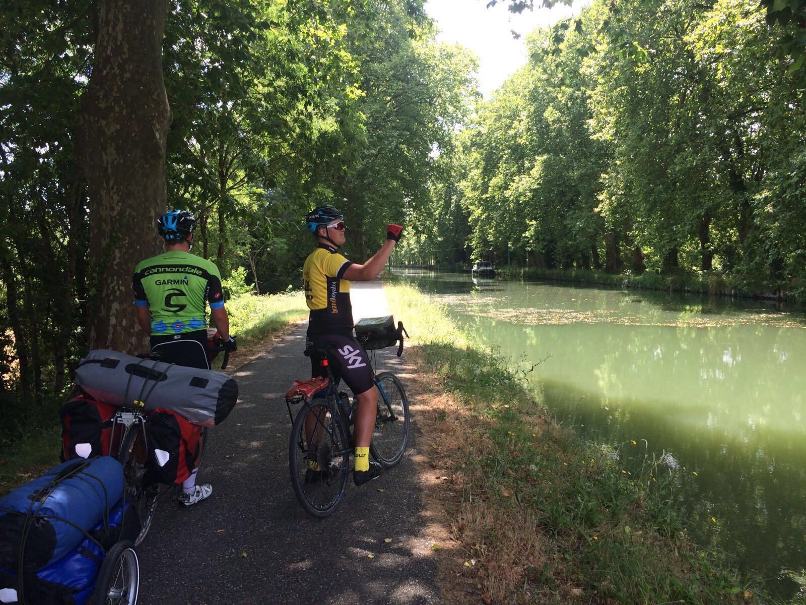 After lunch on the ‘Véloroute des 2 Mers’ http://en.canaldes2mersavelo.com/canal-des-2-mers-velo they started cycling alongside a Canal again, but this time on a well made track in the shade of the beautiful Plane trees, for another afternoon of ‘happy cycling’