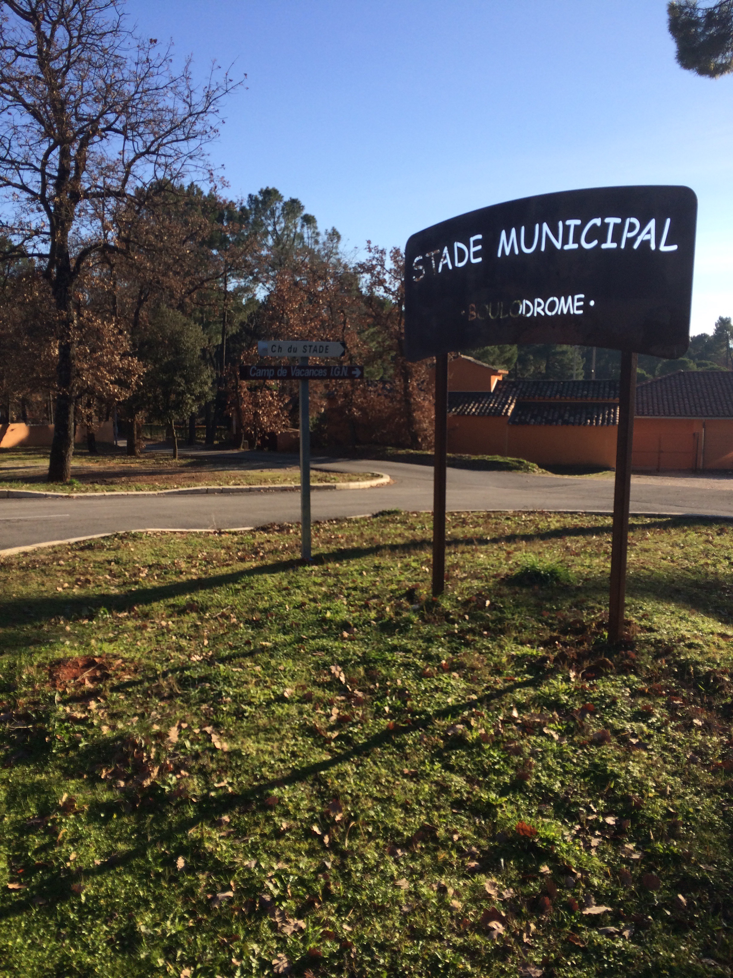 To continue, follow the same road back out of the village, but continue straight on (rather than turning right at the roundabout to head back down to Le Pont Julien). About 200 metres further on you’ll see the Stade Municipal on the right, turn off here and follow the road, bearing left when you reach the fork in the path.