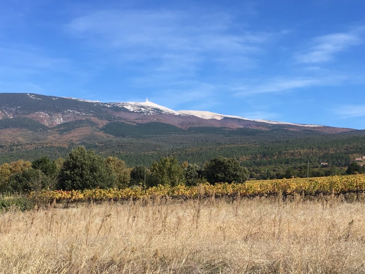 Bedoin is a great town and is always filled with cyclists about to tackle or having just finished tackling the Mountain, but we turned off before we reached it, heading through the vineyards ……..