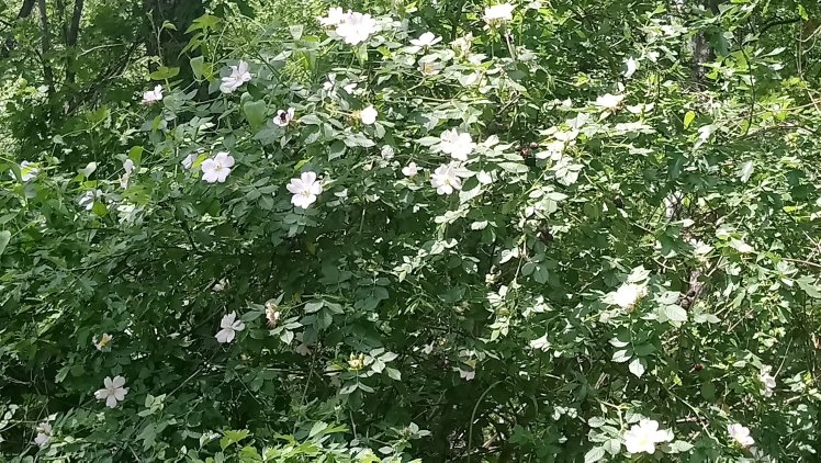 This year the wild roses seem to be bearing more flowers than I have seen before, with their yellow-hearted pink and creamy blooms, ramblings through the hedges and up trees.