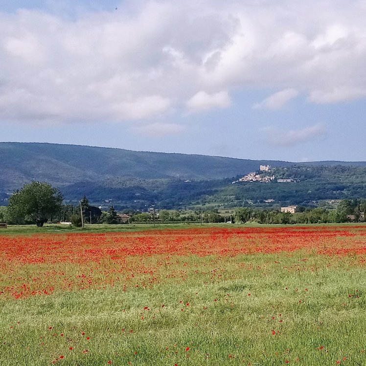 Miss Daisy taking time out by a poppy field between Coustellet and Lagnes