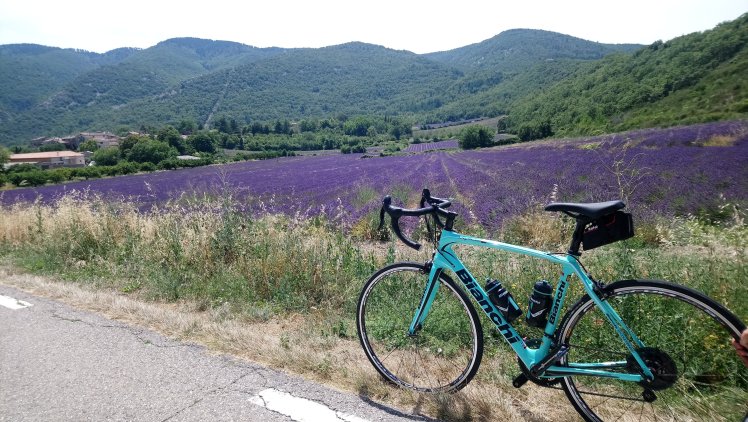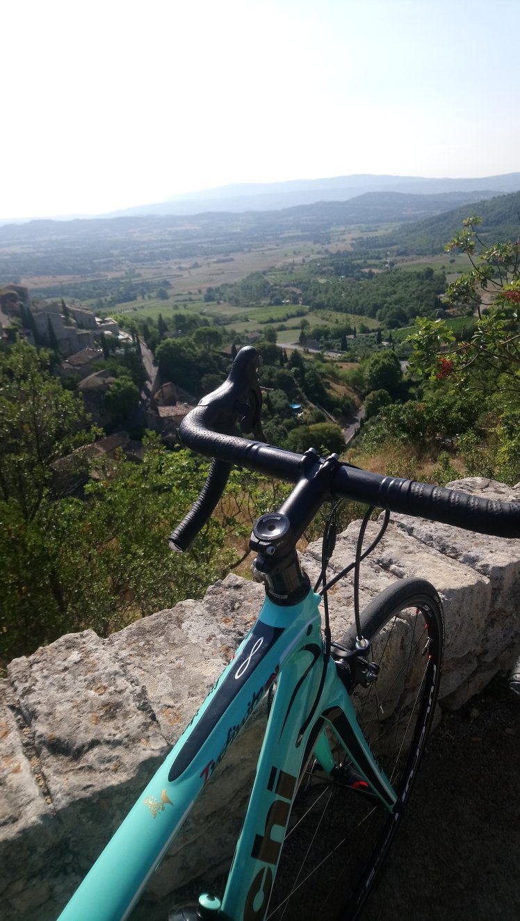 By now the panniers were looking decidedly lumpy, but Andy ploughed on up the hill and across the Plateau Des Claparedes towards Castellet, with me still having to cycle hard to even keep up (even though all I was carrying was my phone) .