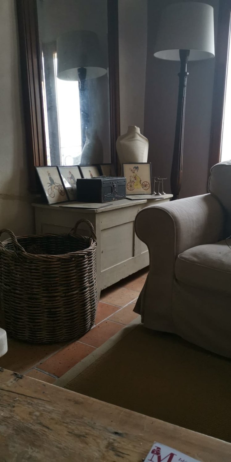 A beautiful old Chest now sits where the sink used to be in the old bathroom, topped with this rather pretty mirror that we found at Carpentras….