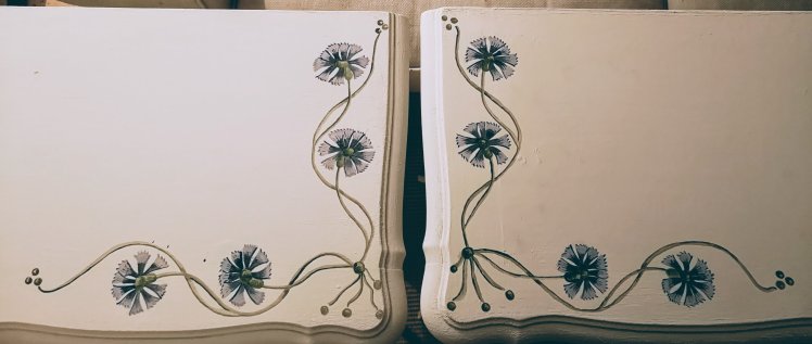 The furniture in one room is now all painted and decorated with a traditional Provencal ‘Bluet’ (Cornflower) design form a book lent to me by a neighbour…..
