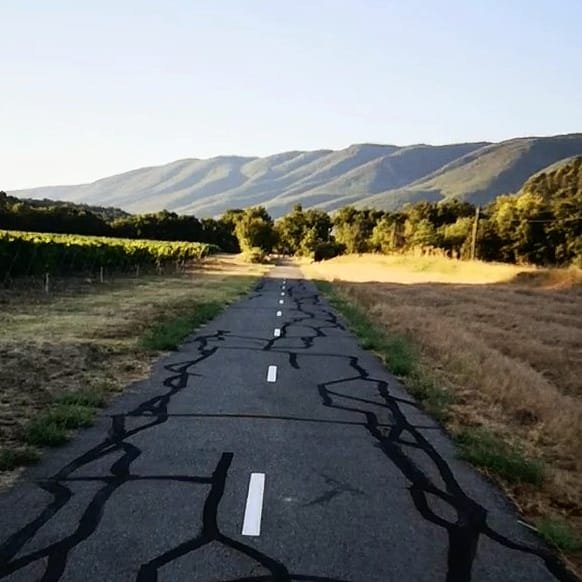 Thanks… It certainly has felt that this year, it’s never rained, but it’s poured! This is on the cycle path, Véloroute du Calavon and it seems to be where tar has been used to fill little cracks that have opened up over time… We see it quite a lot along the route and it always makes us smile, as it looks like a child had been allowed to run riot with a tub of black glue… The good thing is though that the trail is kept in great condition as a result!