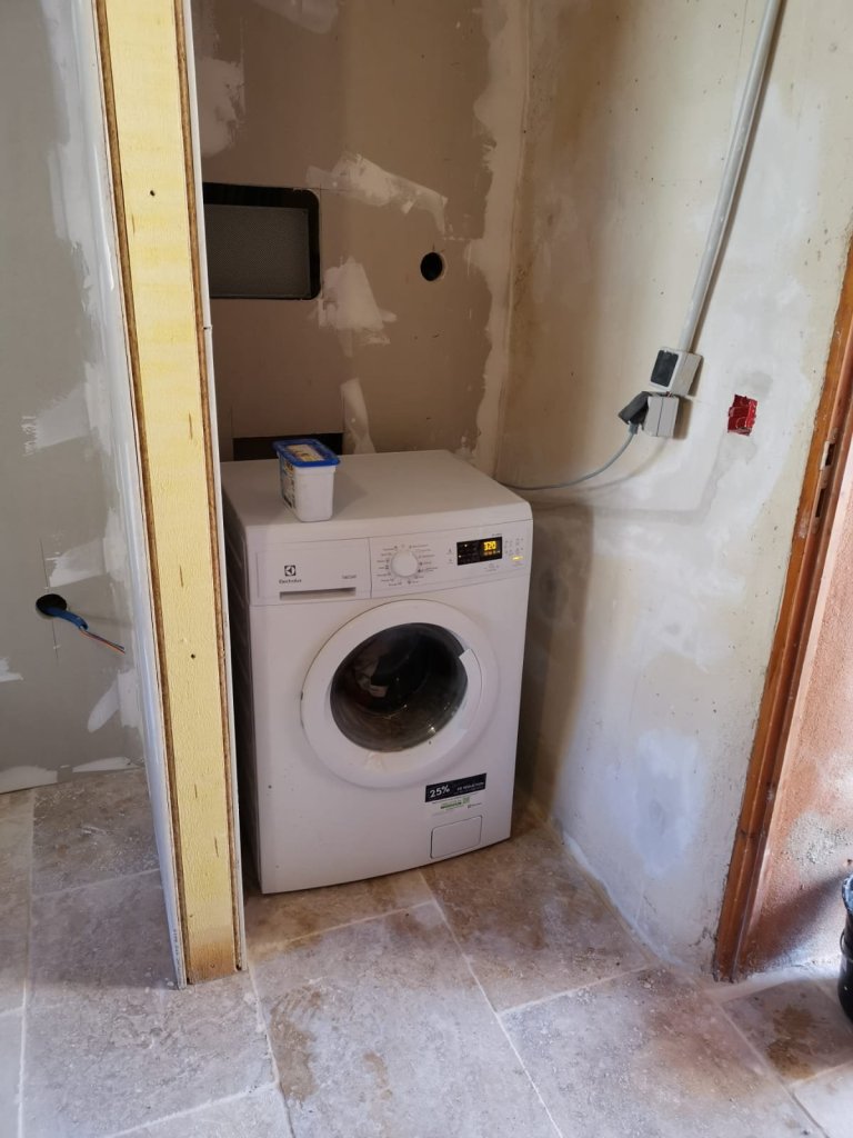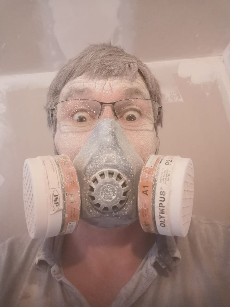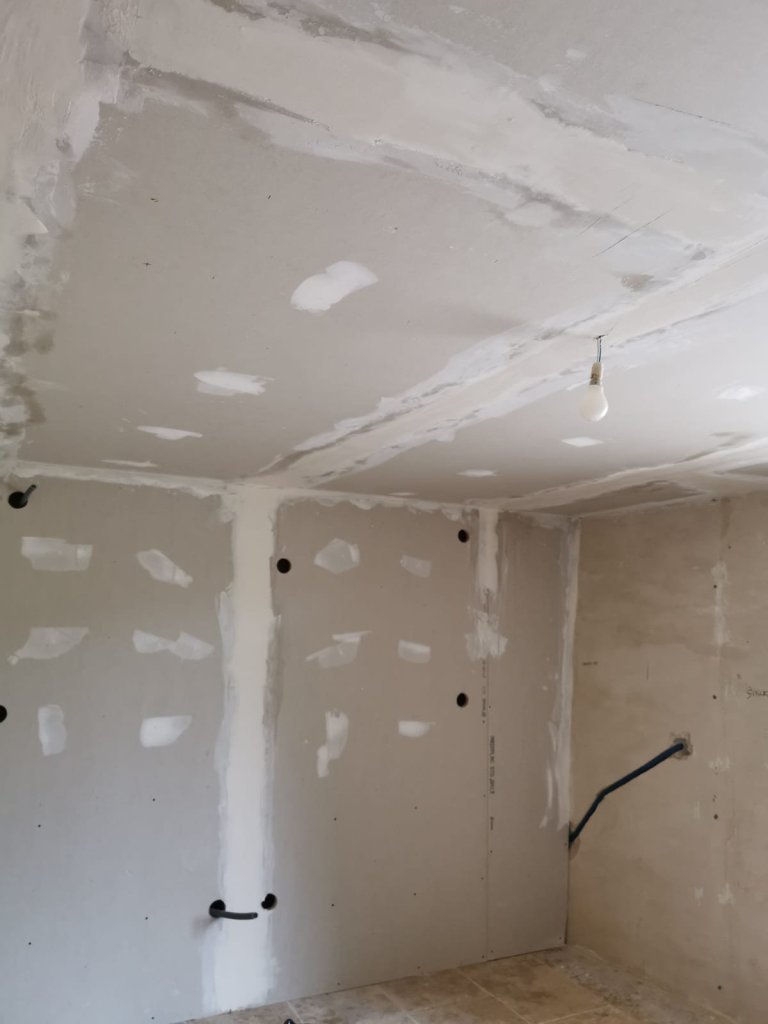 Happily the connections were sound (never in doubt) and Andy finally had clean clothes again, which you can probably imagine, was an absolute joy. They didn’t stay clean for long though, as the next task saw him spending a whole day, filling all the fixing holes and joints in the plasterboard, a long and finnicky task, especially with so many above his head, in the ceiling too.