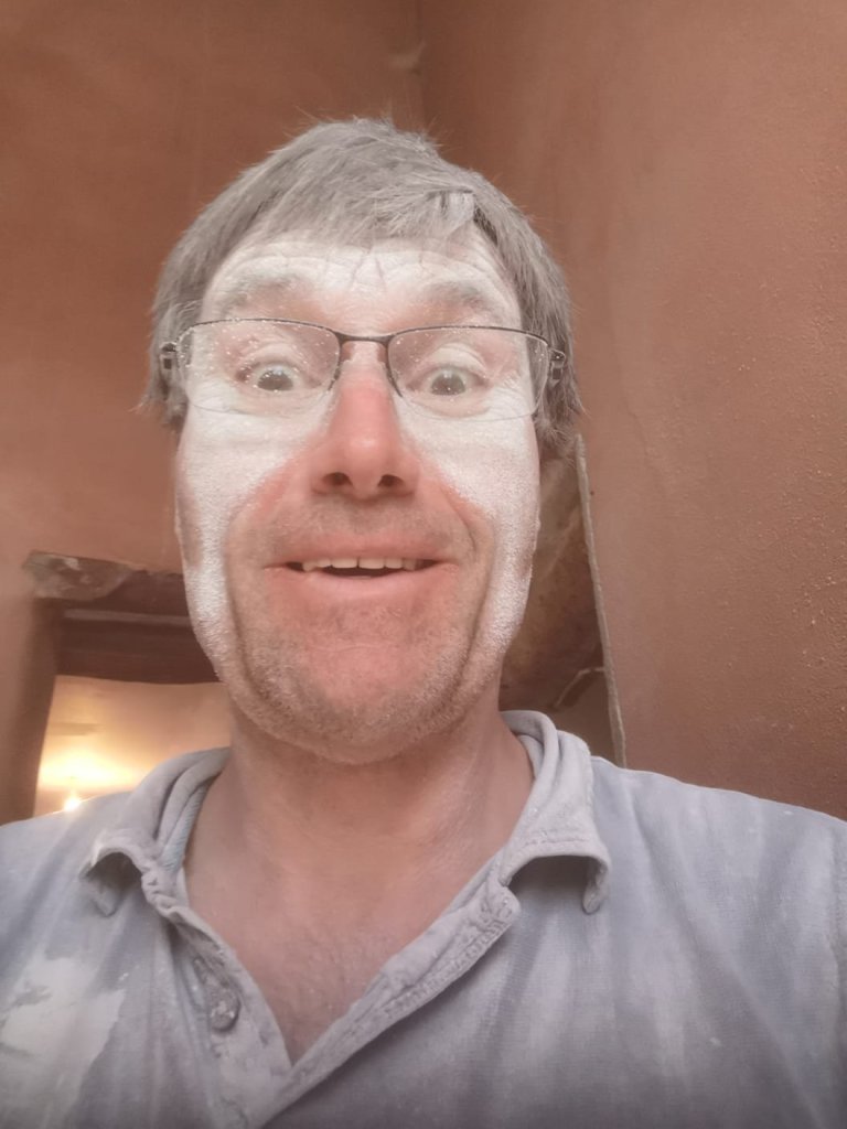 The blocks of white dust on his face, made it look as if he had been interrupted in the middle of making himself up as a Clown …… it was a quite disturbing sight that nearly put me off my coffee!