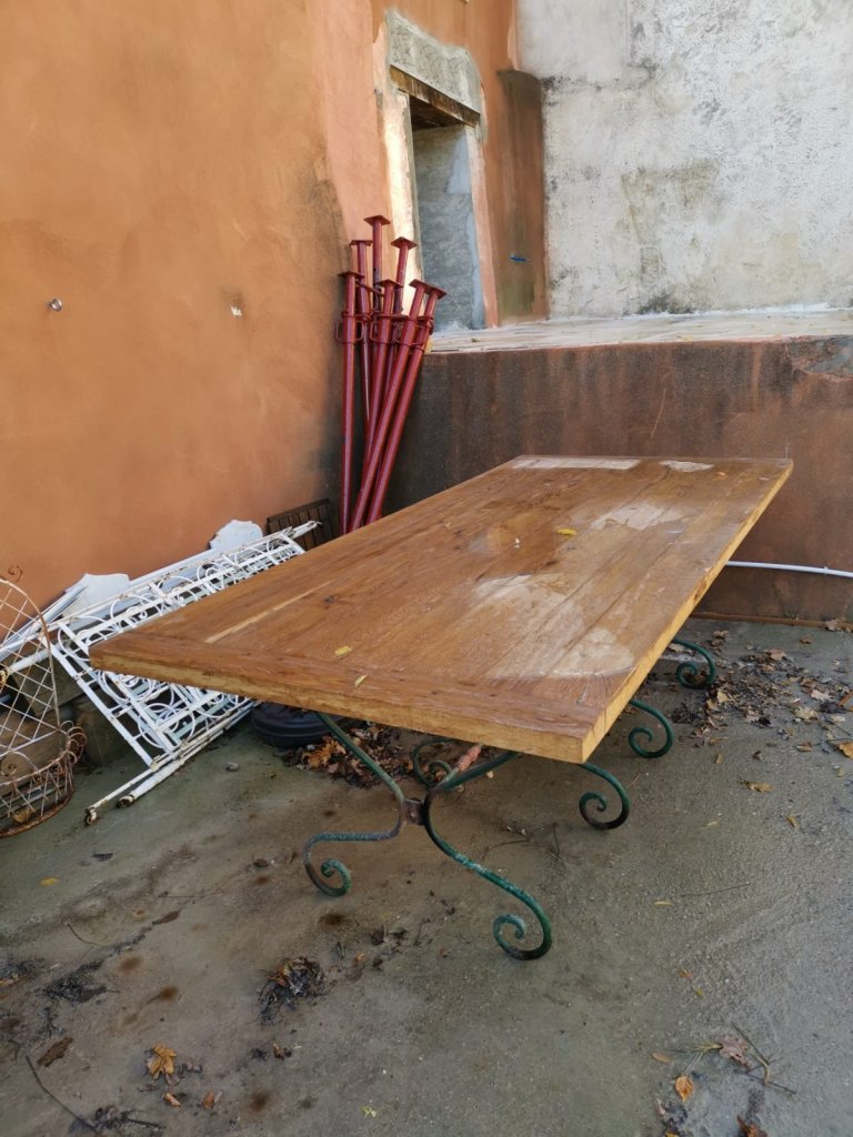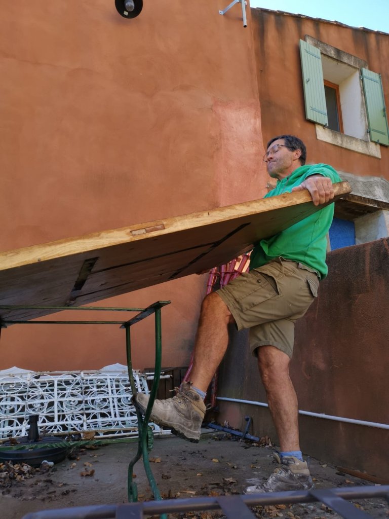 The problem is that this isn’t a small table, nor is it a lightweight table – it is over 2 metres long, at least a metre wide and a good 6 cm thick of solid, well-seasoned French Oak and lifting it over a metre up onto the top terrace (even with a group of helpers) was never going to be a simple task. Add in the complications of lockdown, removing any option of friends to help lift it, Andy was faced with doing it all himself.