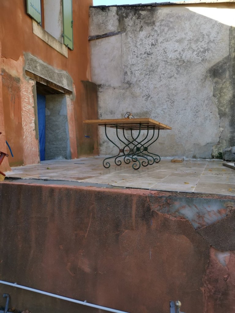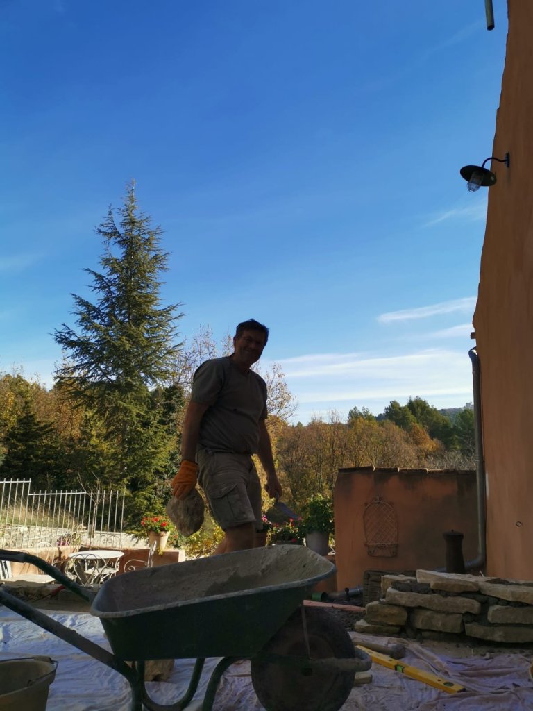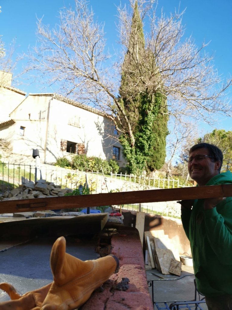 The thing is, it made perfect sense to me, this was a huge step forward and really did signal how much Andy had managed to get done over the last few weeks. It meant that it was finally time for him to lift the wonderful table that Pascal had created for us nearly 4 years ago, from the lower terrace onto the new one. The table, that so much of our ideas have been built around, the one where we dream of sitting with coffee or a glass of wine, just absorbed by the shadows shifting across our newly discovered view.
