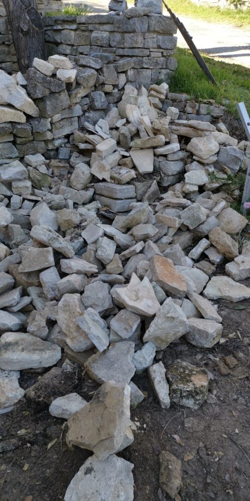 Carefully selecting stones, from the now dwindling pile that had been removed from the house, and starting to build the new barrier wall along the front edge…