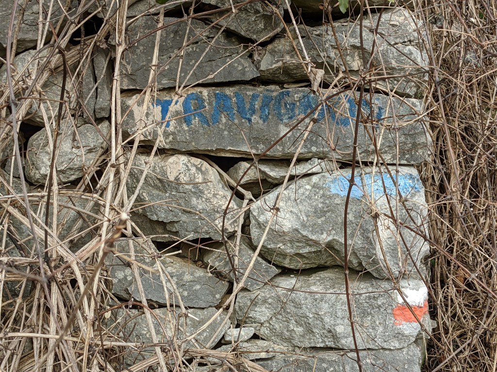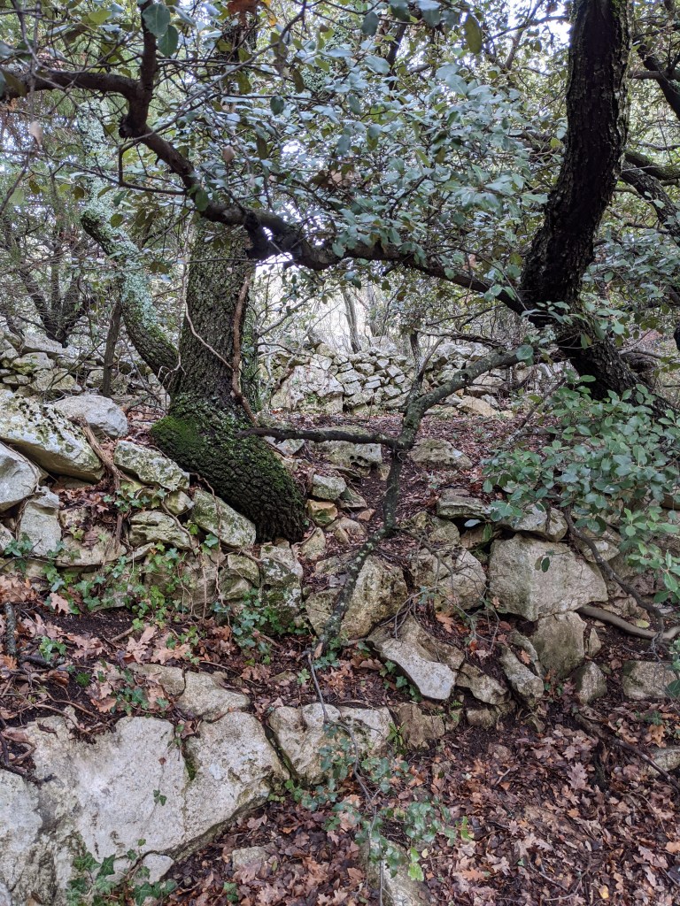 After over 6km of climbing we turned onto the path to Travignon, which took us through beautiful woodland, with moss-covered trees and boulders, still climbing higher. By this time I was really wondering whether it would be worth the effort, but then I suddenly found myself passing the first of the collapsed buildings, and the ancient old ‘restanques’, the terraces that were built to help residents grow food and crops.