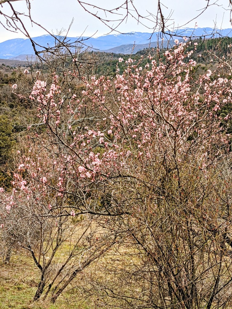 And finally the discovery yesterday, of a collection of Almond Trees on a hill facing Valsaintes , which were in full blossom, their pink flowers a real herald of spring, making my heart sing.