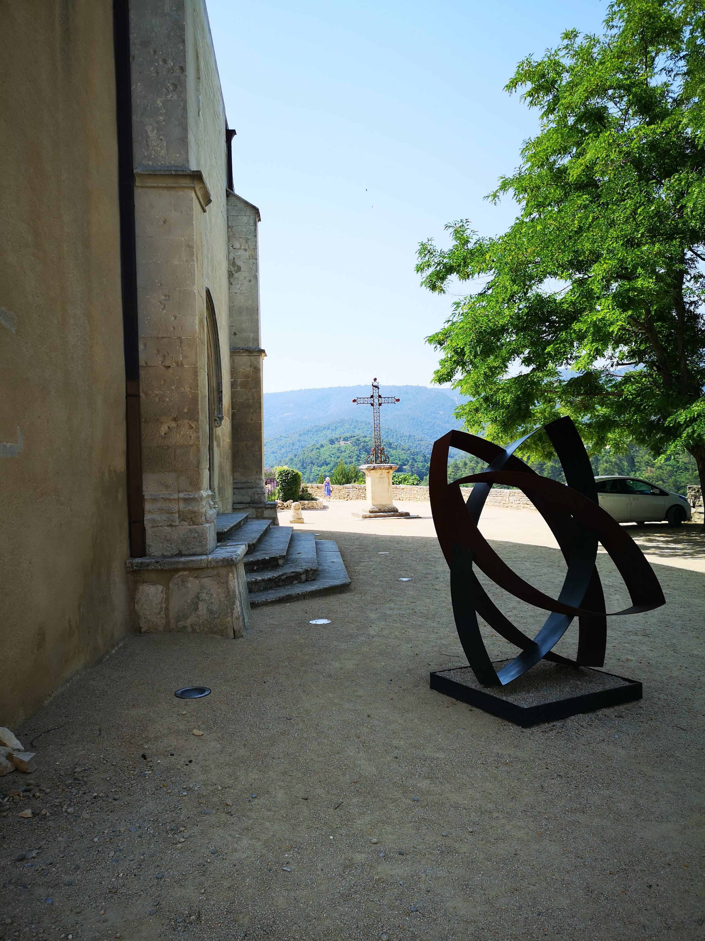 Looking out from ‘our wall’, over the viewpoint and across the terraced garden filled with sculptures, Françoise explained that the small Chapel that we always look at, is named after Notre Dame de Grasse. It was one of many built just after the Plague swept through the area, being constructed on the edges of villages which survived the Plague, to thank God for saving the villagers, and to protect them from future, similar epidemics…….