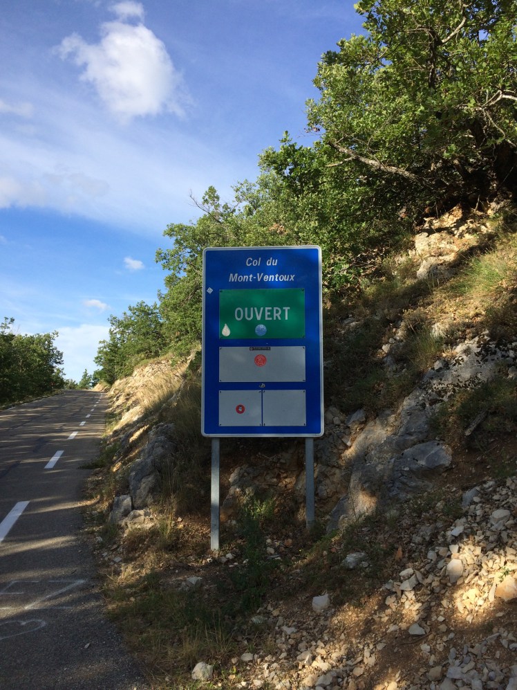 After buying provisions from the Boulangerie I started the ride up the mountain. It seemed really hard going, the wind was blowing but not too badly, perhaps it was just that my legs were still tired after Monday’s ride. It was only when I stopped at the sign showing the Col as open that I realised my front brake was seized on! After a quick repair & managing to free it I hopped back on & surprisingly the bike seemed to fly up the mountain – what a fool!