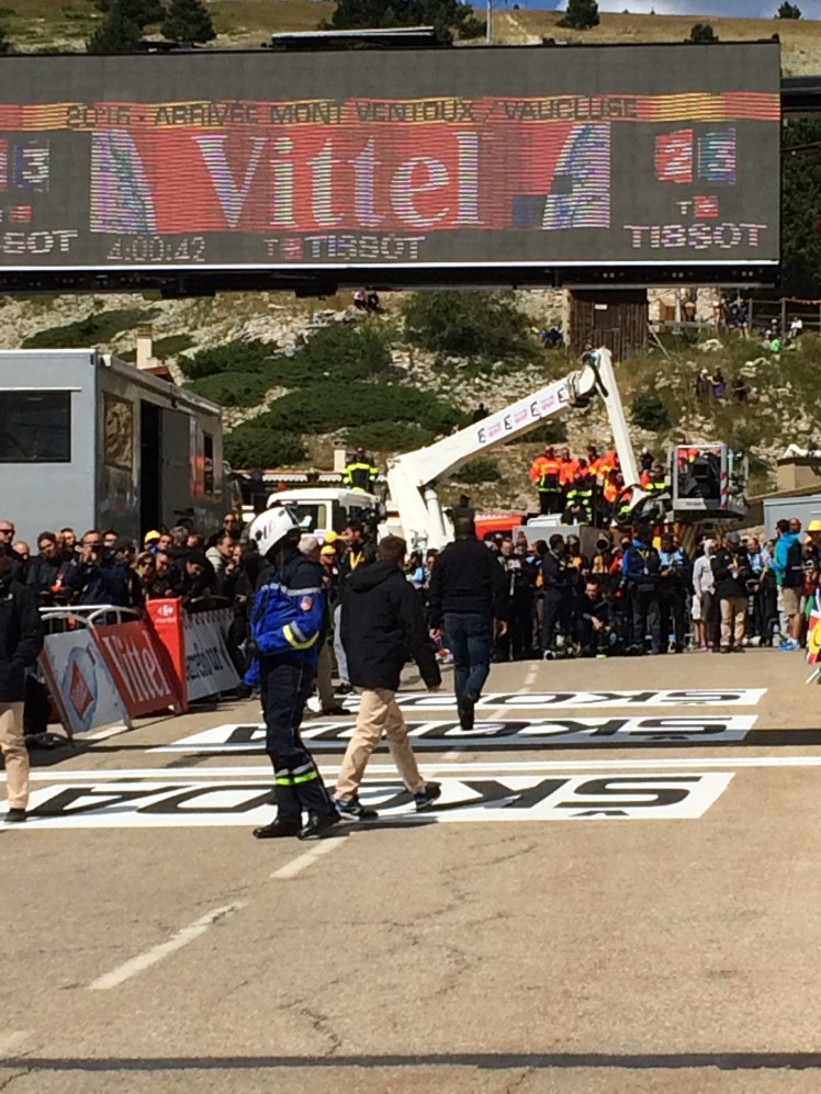 Once the Caravan had passed the commentary team picked up the race from the bottom of Ventoux – and at last the riders were nearly with us. It was clear there was quite a battle going on in the race, although I think it’s fair to say we didn’t get information on everything that was happening, bearing in mind what I saw after!
