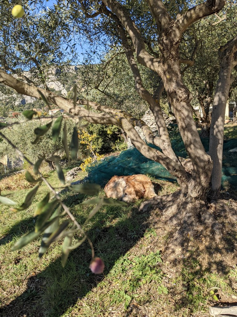 But the olive harvest couldn’t wait for Millie to get bored, so off we went, back to the task in hand, checking we had stripped as many olives as we could, before moving onto the next tree, whilst Millie stretched out in the sun, relishing just being outside with us, occasionally entertaining herself with a fallen olive, or a broken branch.