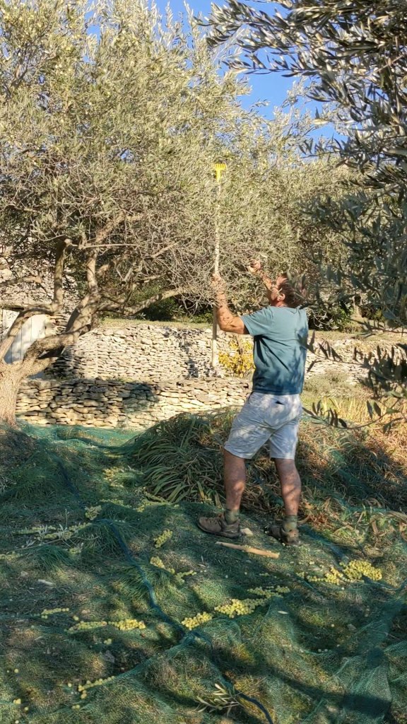 It was over coffee, that we were introduced to another method we could use to get the olives from the trees, using plastic rakes to strip the branches, allowing the olives to fall onto nets, which are spread out on the ground below. These can then be lifted up gently to allow the collected fruit to be dropped into containers.