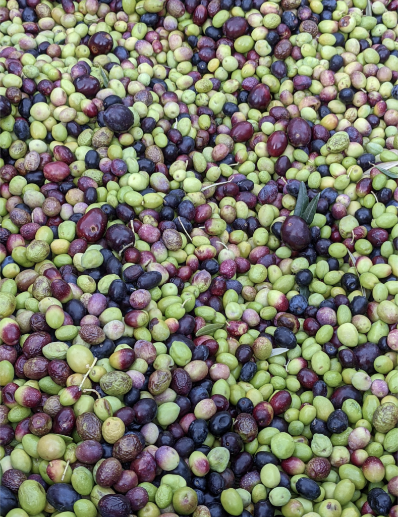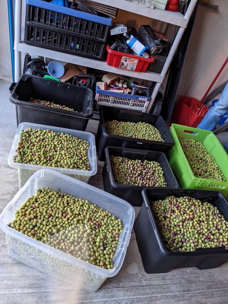 As the sun finally disappeared, the floor of our friends’ garage was already well-hidden under boxes filled with a kaleidoscope of fruit, and a quick-tot up took the tally to well over 100kg of olives picked so far. But that was only the start.