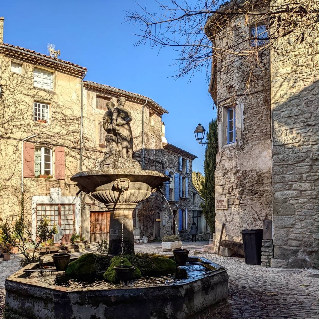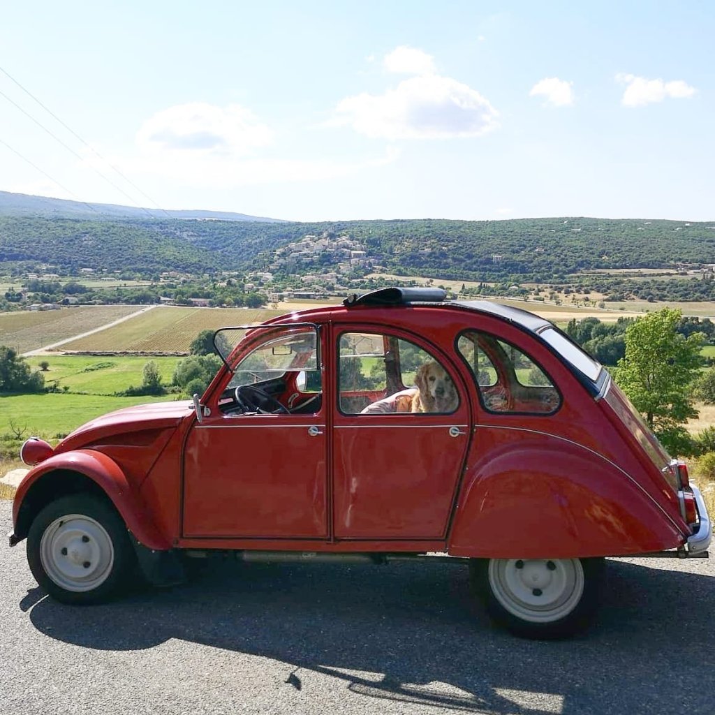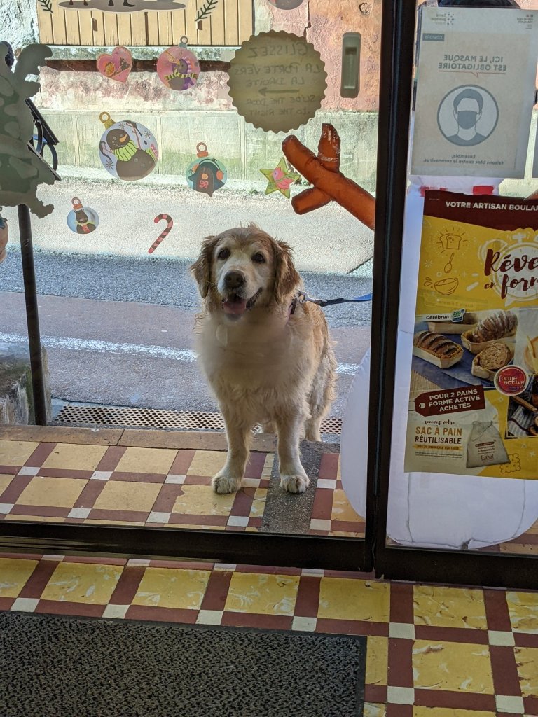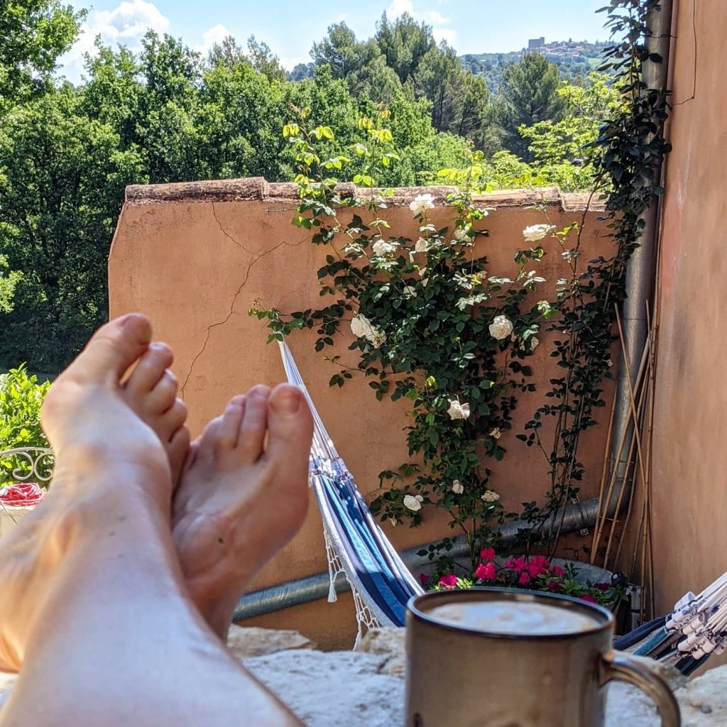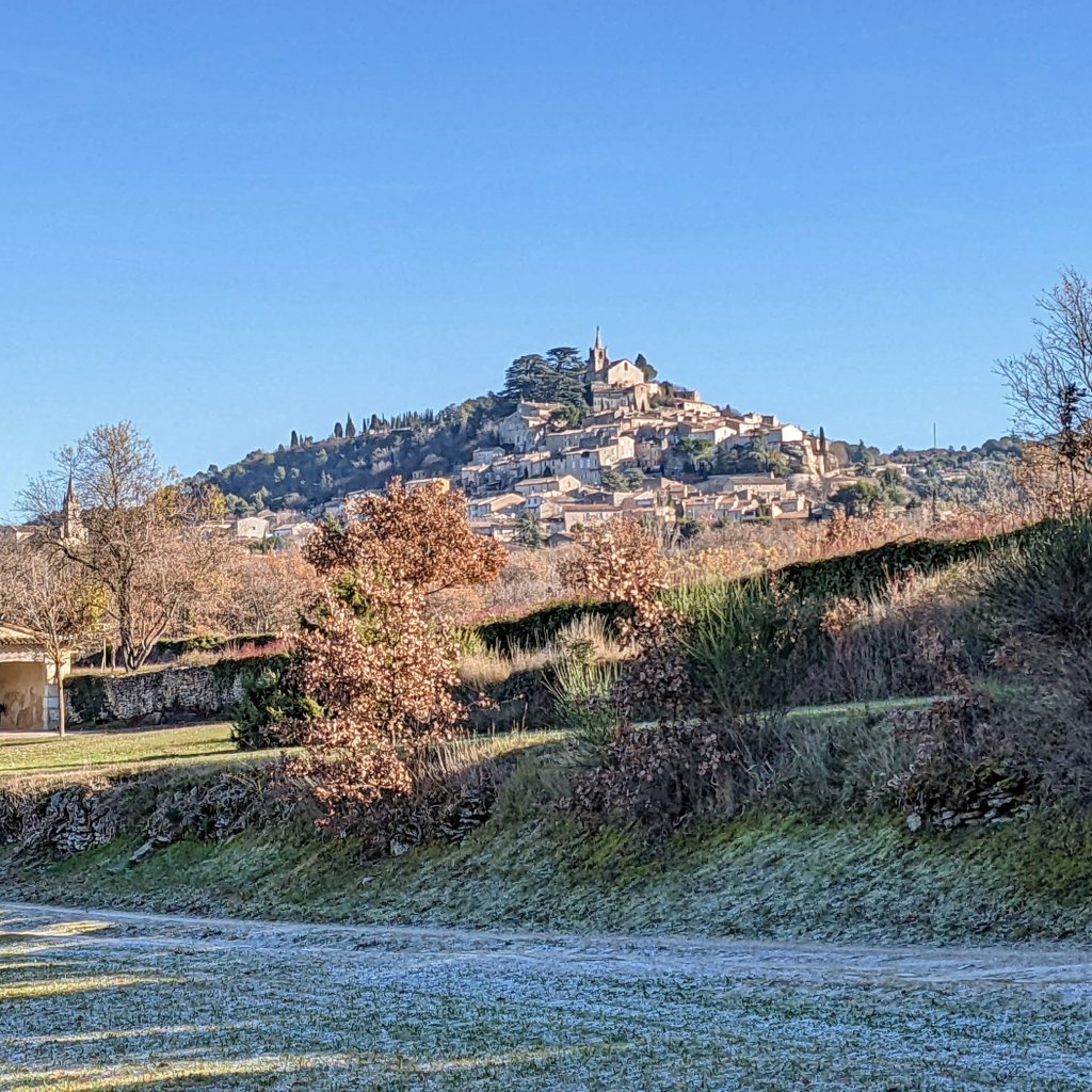 This morning, I took Millie on a loop from Les Huguets to Roussillon and back, sitting on a bench in the square with a pain au chocolat and a take-away coffee from the Boulangerie.