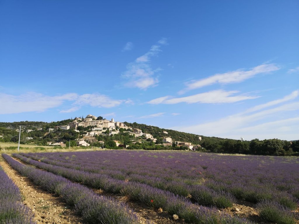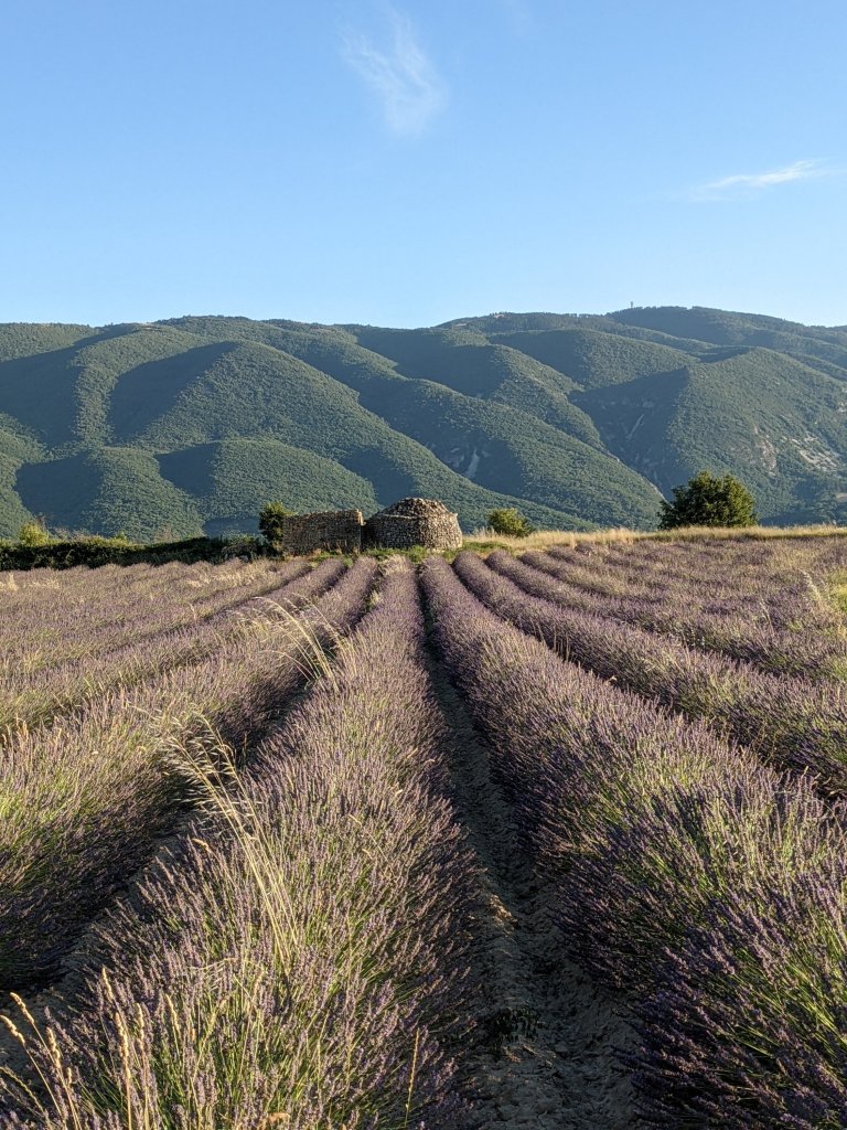 Eventually we did manage to tear ourselves away from the terrace and head home, taking a route past the lavender fields which look at their best with the evening light on The Grand Luberon behind them.