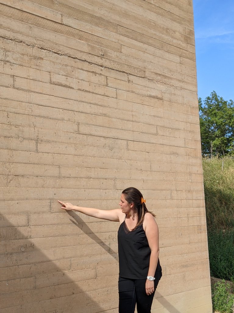 The building was designed by Marc Barani, who clearly had to work very closely with the planners in the Luberon National Park, to ensure that he met their requirements to preserve the integrity of this beautiful part of the world. Although it is made of concrete, apparently the best product for insulation and to maintain a stable environment for the wine production, each concrete block has been made in a wood casing, creating blocks that are the size and shape of planks of wood, with the grain and even knots visible on the surface. Each block has also been tinted with the local ochres, mimicking the colours of the Colorado at Rustrel and surrounding soils, to ensure it sits more comfortably in the landscape.