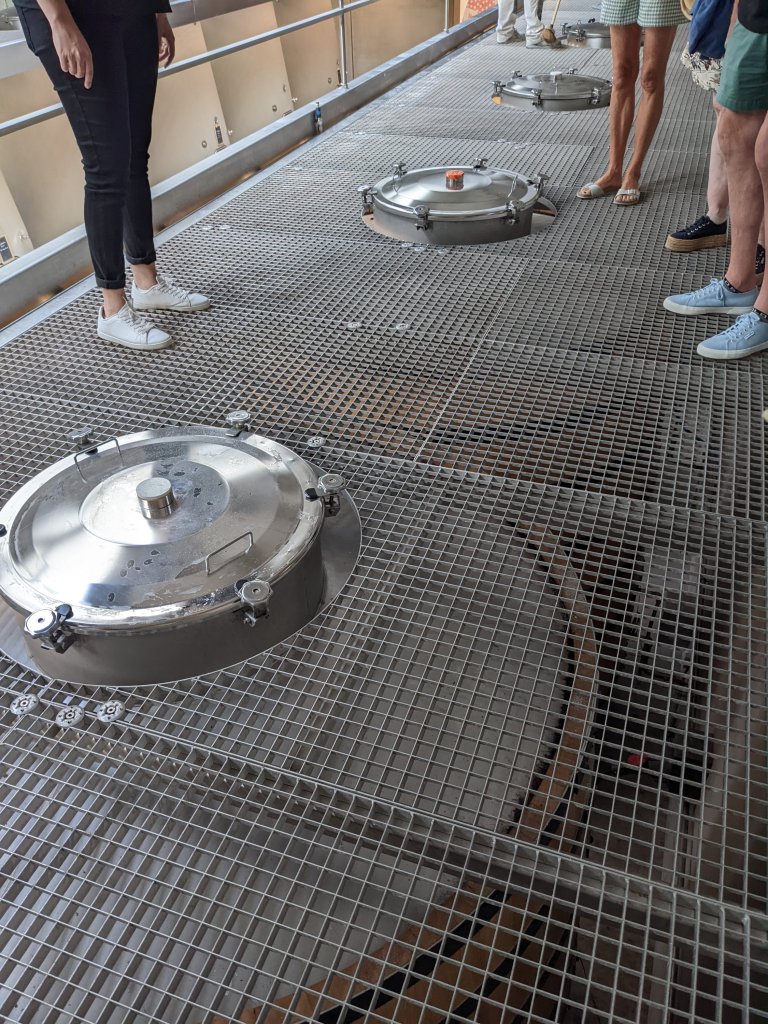 She explained how for the red wines, the skins of the red grapes are left in the process for 2 weeks, whereas for the lightly blushed rose wines it is 2 hours. From this sorting room the grapes are placed into big hoppers, which are then wheeled into the main space, where the lids of the vats are opened and the grapes allowed to drop in. This is not a place for people with vertigo, as the suspended mezzanine level is made of an open grille, with a view down to the main floor a few metres below.