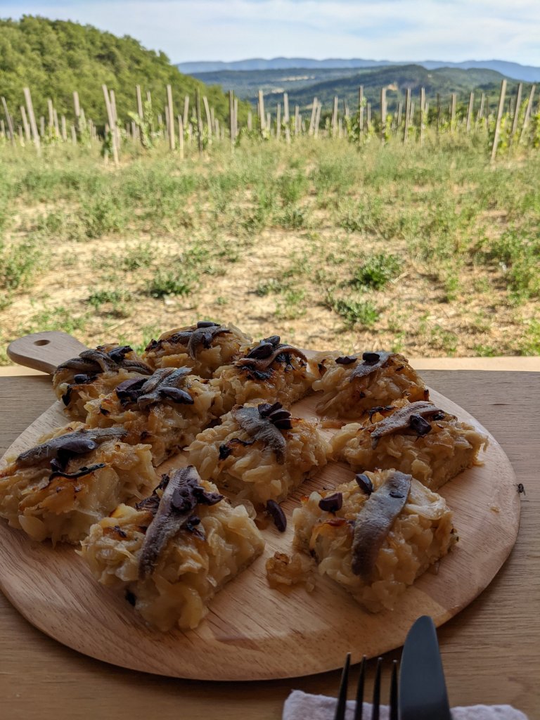 We tasted a few, before deciding on buying bottles of the white and rose to have with our apero, which arrived on wooden platters. It was simply divine, with deep pieces of pissaladiere, filled with sweet, soft onions and topped with anchovies or olives. There was fluffy foccacia, platters of local cheeses, with the Banon oozing gently as we removed its coat of chestnut leaves…