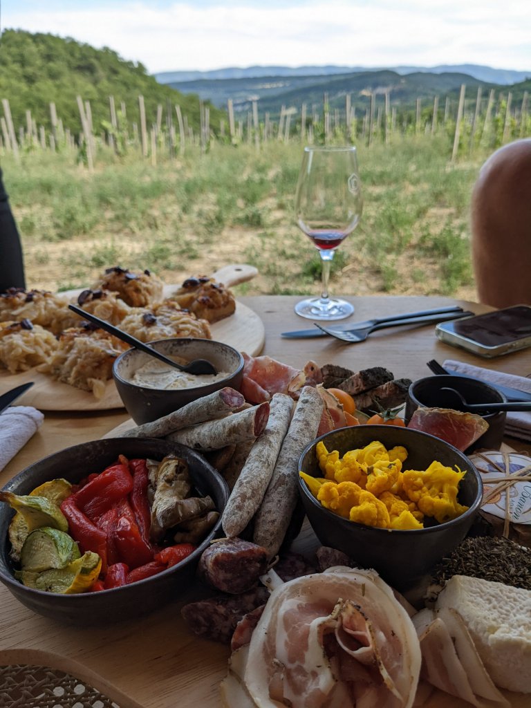 For that we went back onto the terrace, where chairs and low tables had been set up overlooking the view and the wine list was explained to us, with a total of 11 wines available, of which 6 are red, 3 white and 2 rose
