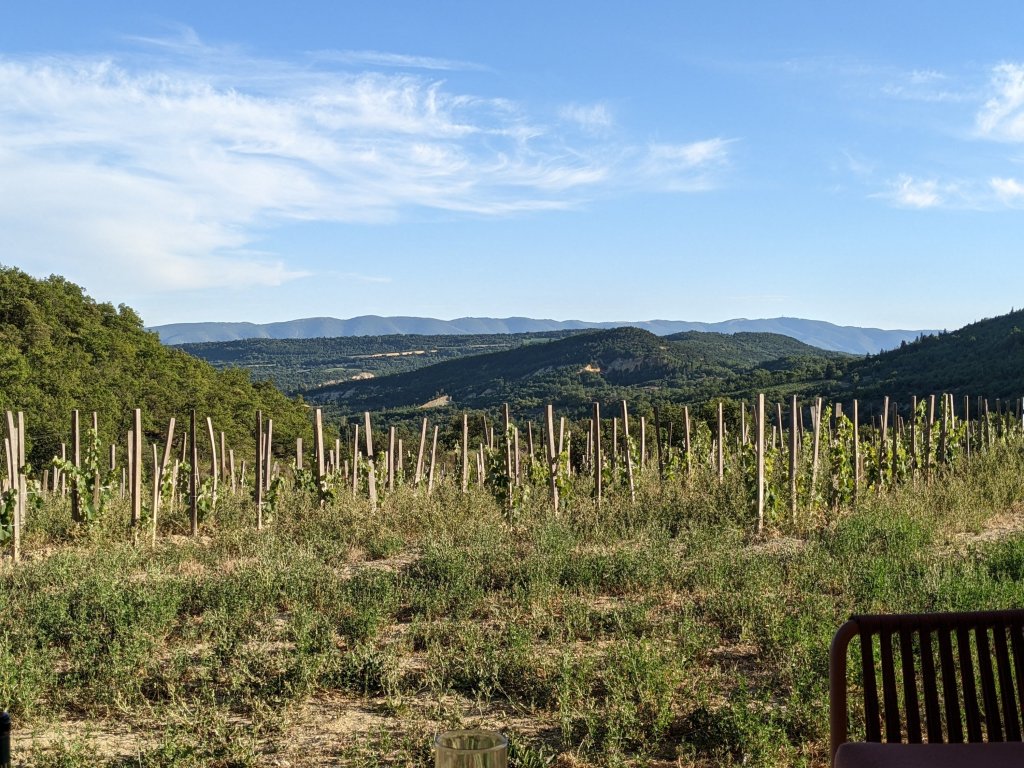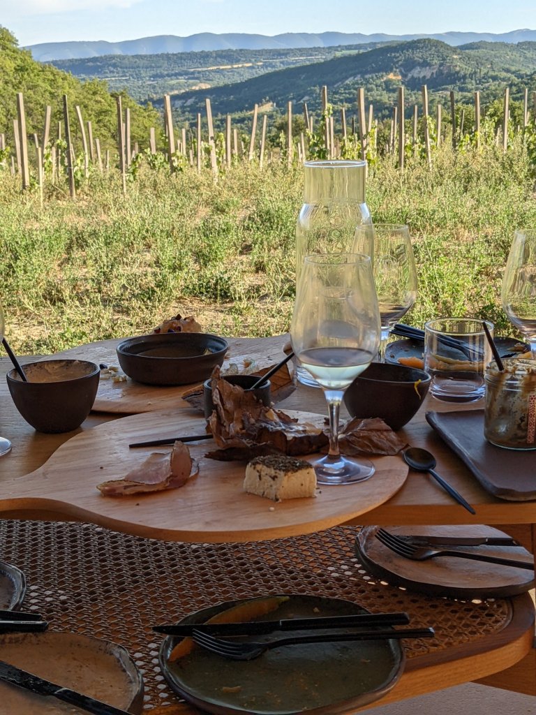 It goes without saying that the time passed quickly and we sat chatting, enjoying the food and wine and simply enjoying the view down the valley, watching as the shadows started to deepen and lengthen across the flank of the Luberon, beyond Viens.