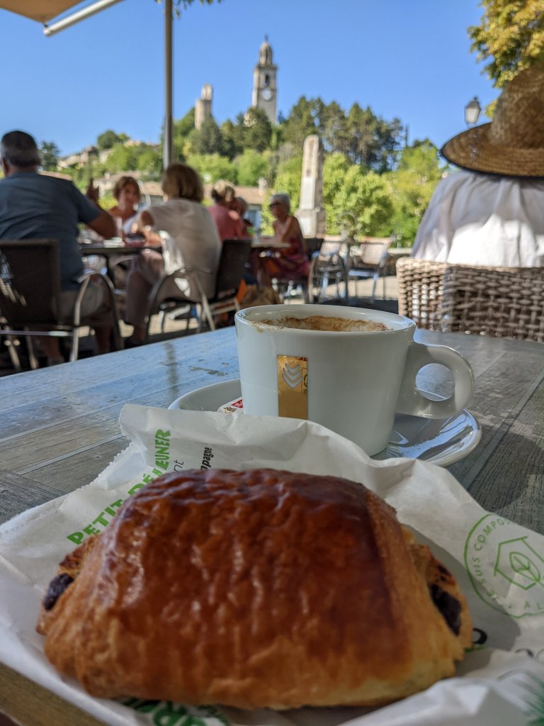 The lovely old church dominates the village, with the remains of the old castle wall too and I was happy to sit with a coffee, munching on a pain au chocolat, at the Cafe Du Cours, listening as the bells chimed the hour and watching the bustle in the square below, finally dragging myself away, after mulling over whether to have a second coffee …. it was one of those mornings…