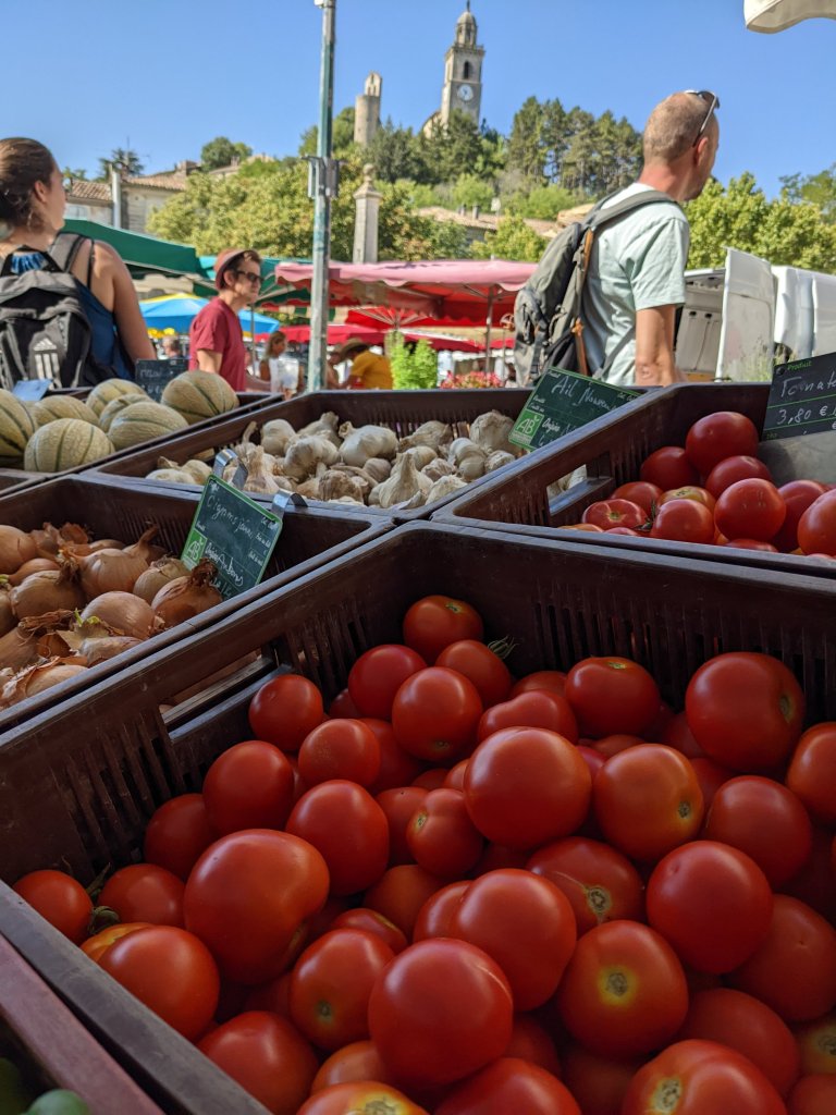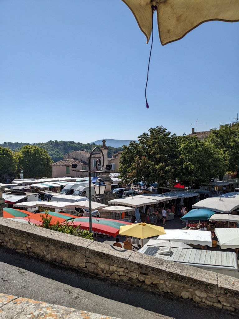 Reillanne is a very pretty little place, just beyond Cereste, with a traditional, open market square, that is packed with the bright awnings, protecting the stalls from the sun, creating a sea of colour below the road
