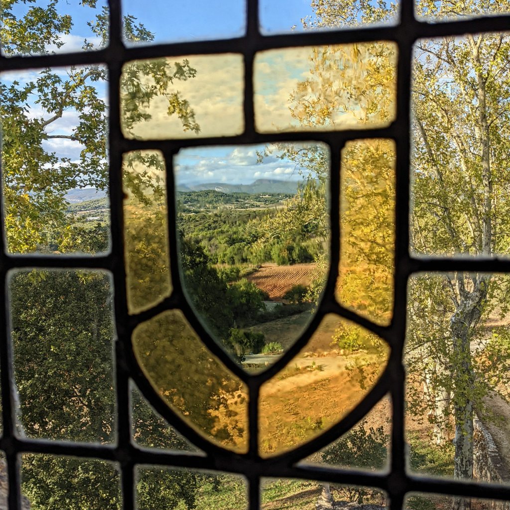 The beautiful stained glass window, to the front of the chapel, frames the view across the valley and gives a sense of why the chateau was built here, as it would have had open views of anyone approaching Apt, who needed to be intercepted or perhaps encouraged to go elsewhere…..