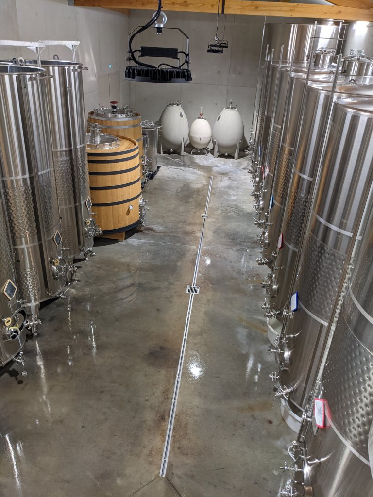 And in the neighbouring room were other vats, made of stainless steel for production of the whites and rosés, with the unusual, egg-shaped vessels designed to facilitate the fermentation of the different wines ….