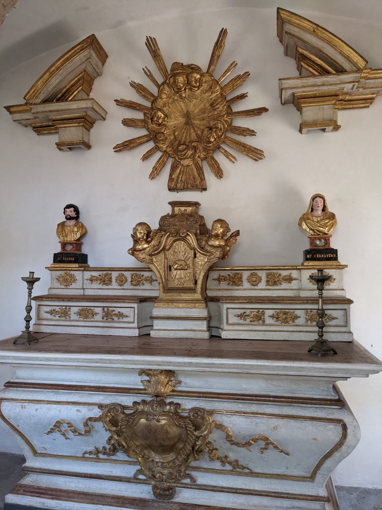 At the top of the steps is another Troglodytic dwelling and above that the old stone tower, which was converted into a Chapel, dedicated to Saint Lucide and Sainte Celestine, whose relics sit in statues, placed on either side of the magnificent, gilded altar…..