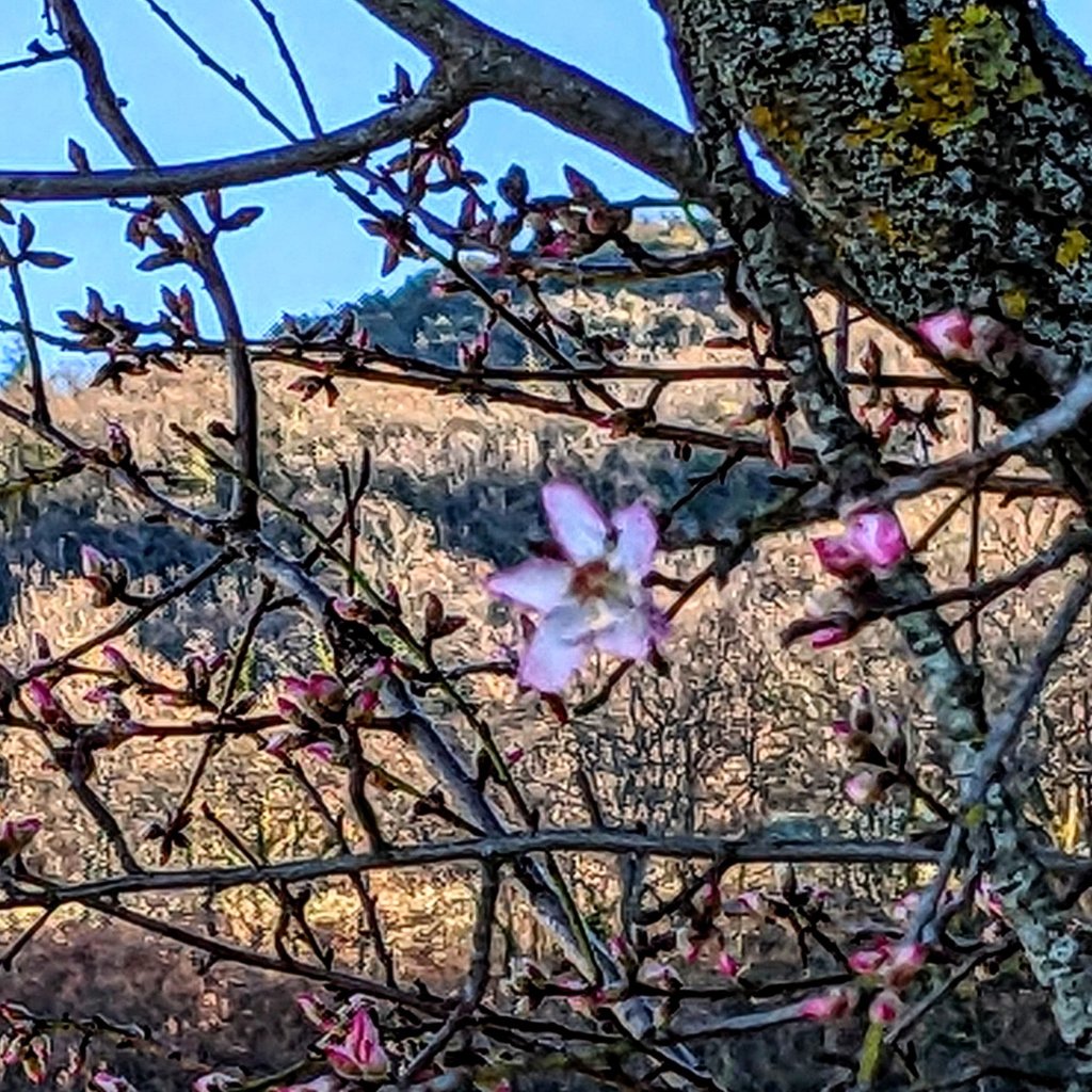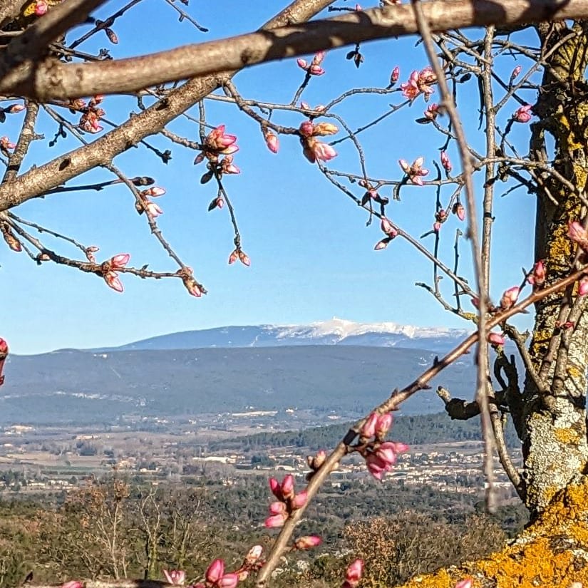 It happened this week and when I first cycled past on Wednesday afternoon (having changed my route simply to pass by), the buds were glowing pink, with just one bud having burst open; its fragile flower fluttering in the vicious Mistral that was hurtling its way across the valley, bringing with it the snowy chill from the summit of Mont Ventoux. It may only have been a single flower, but it was enough and marked the fact that the season had turned a corner and that Spring was finally on its way.