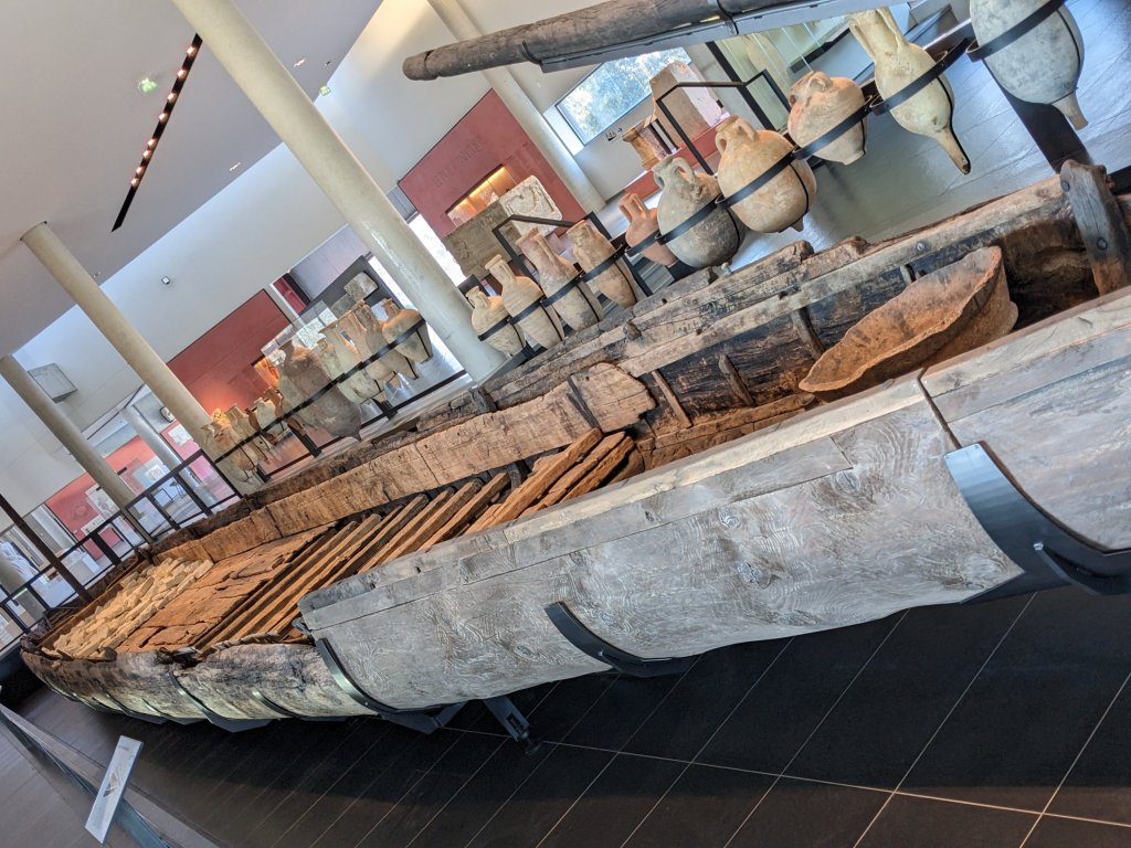 Arriving at the Museum,( https://www.arlesantique.fr/en ) we bought a month’s pass that allows access to a number of sites in the city and at a price of 12 euros per person, seemed to be excellent value, even though we would be there for just the day. The Museum itself is well laid out, with excellent explanations on how the city had developed during the Roman period, to become a thriving and important port for the movement of goods across the extensive Empire. There is a superb collection of artefacts, reflecting the high status of the buildings and city itself, but the jewel in its crown is the incredible Roman Barge that would have transported goods on the river there, some 2000 years ago.