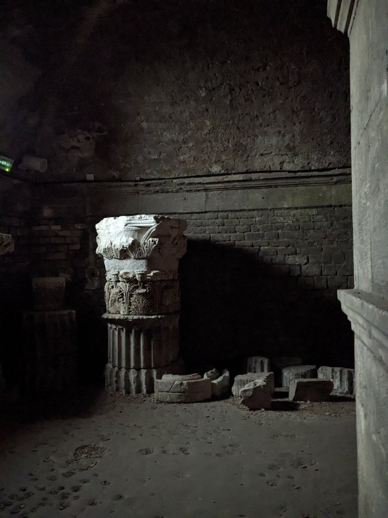 The structure, now hidden below the magnificent Town Hall, is rather beautiful, and is littered with odd bits of Roman buildings that lie along the side of the tunnels, including lengths of decorative columns and intricately carved capitals, like this one, that was lit by a small ground-level window, to dramatic effect….
