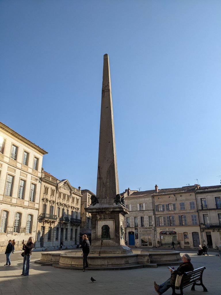 We emerged back into the sunlight, onto a beautiful square with a central 4th century obelisk, which was originally in the ‘circus’, which had been near the site of the Museum and would have played host to a range of entertainments (including horse and chariot racing). The Arles ‘circus’ had been abandoned in the 6th century and the obelisk was later found and relocated to this square, where it takes pride of place, surrounded by buildings dating back to the 1600s.