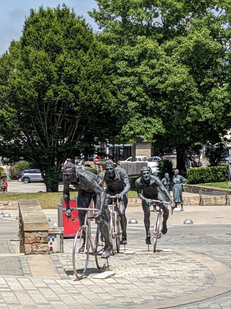 before we climbed up into Carhaix, which brought back so many memories for Andy and his ride with the boys. They had arrived in the town, when it was hosting France”s version of Glastonbury ‘Les vieilles charroux’ and the town was a mad, chaotic scene of festival life. They somehow even cycled into the festival ground, only to be ushered out by security guards … In fact I think this sculpture commemorates them being chased out!