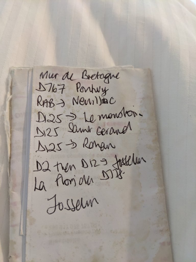 What a day …. Apologies for not posting this last night, but after a full day”s ride we turned up at our delightful Chambres D’Hote in Caurel and got chatting to another couple, who are also touring on their bikes and ended up having supper with them too. So by the time we got back to the room, all I could do was sleep ..