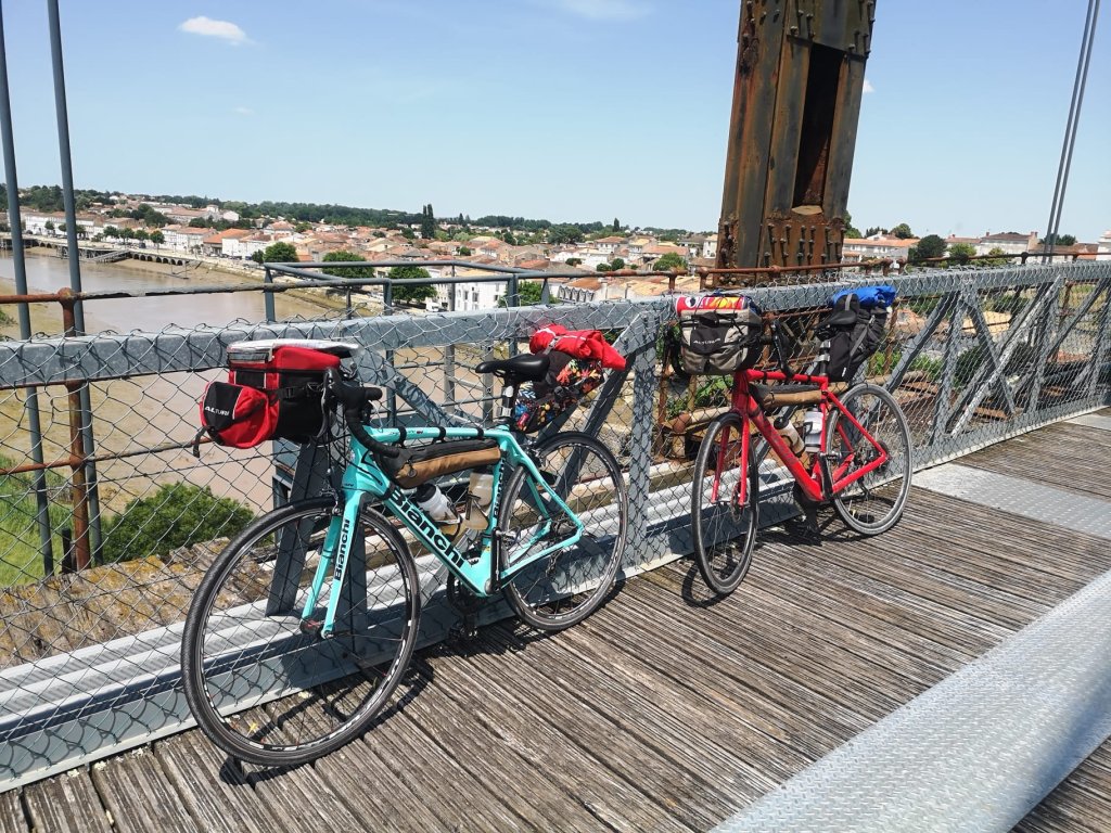 So off we pedalled, turning away from the coast and heading out through the salt marshes towards Rochefort, soon seeing the metal frame of the Transporter Bridge in the distance, sure that we’d be there in plenty of time.