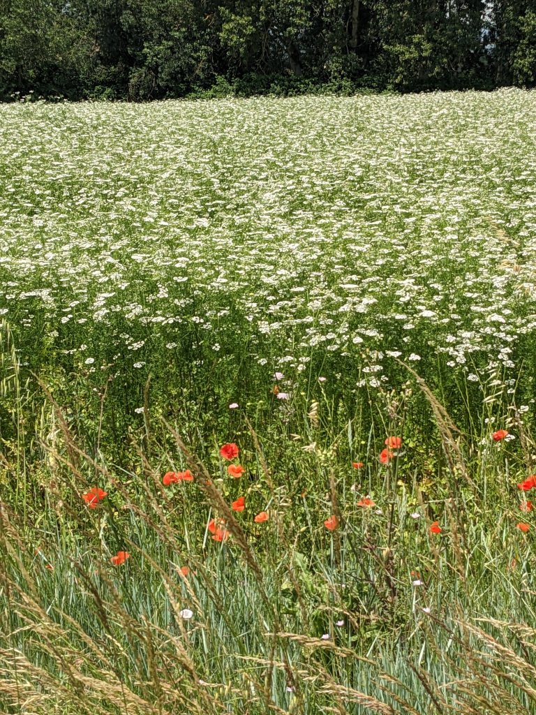 And through fields dotted with wildflowers, under what we’re now bright blue skies…