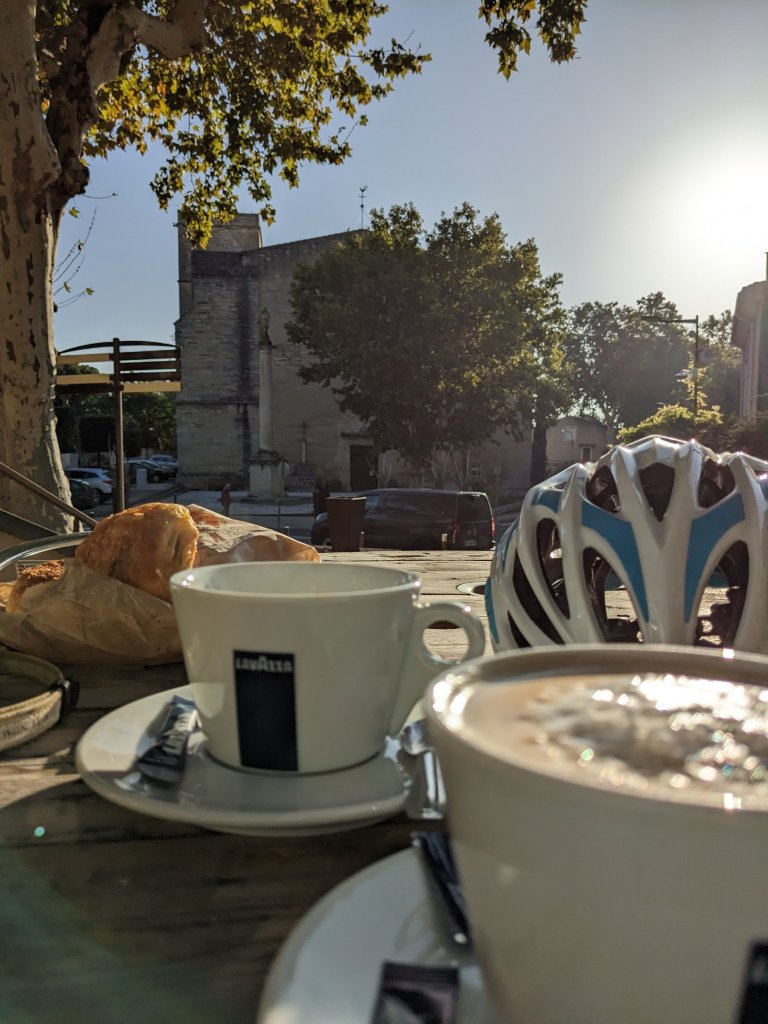 This morning dawned bright, but fresh again and as we cycled out of Pezenas towards Tourbes for breakfast, I wished (for the first time) that perhaps I had popped my gilet on over my jersey. There was a real autumnal feel to the early morning, although as soon as the first rays of sun touched us, we quickly warmed up, and enjoyed a peaceful time watching the world pass by, as we munched our pain au chocolat & drunk a coffee at the café in the centre of the village.